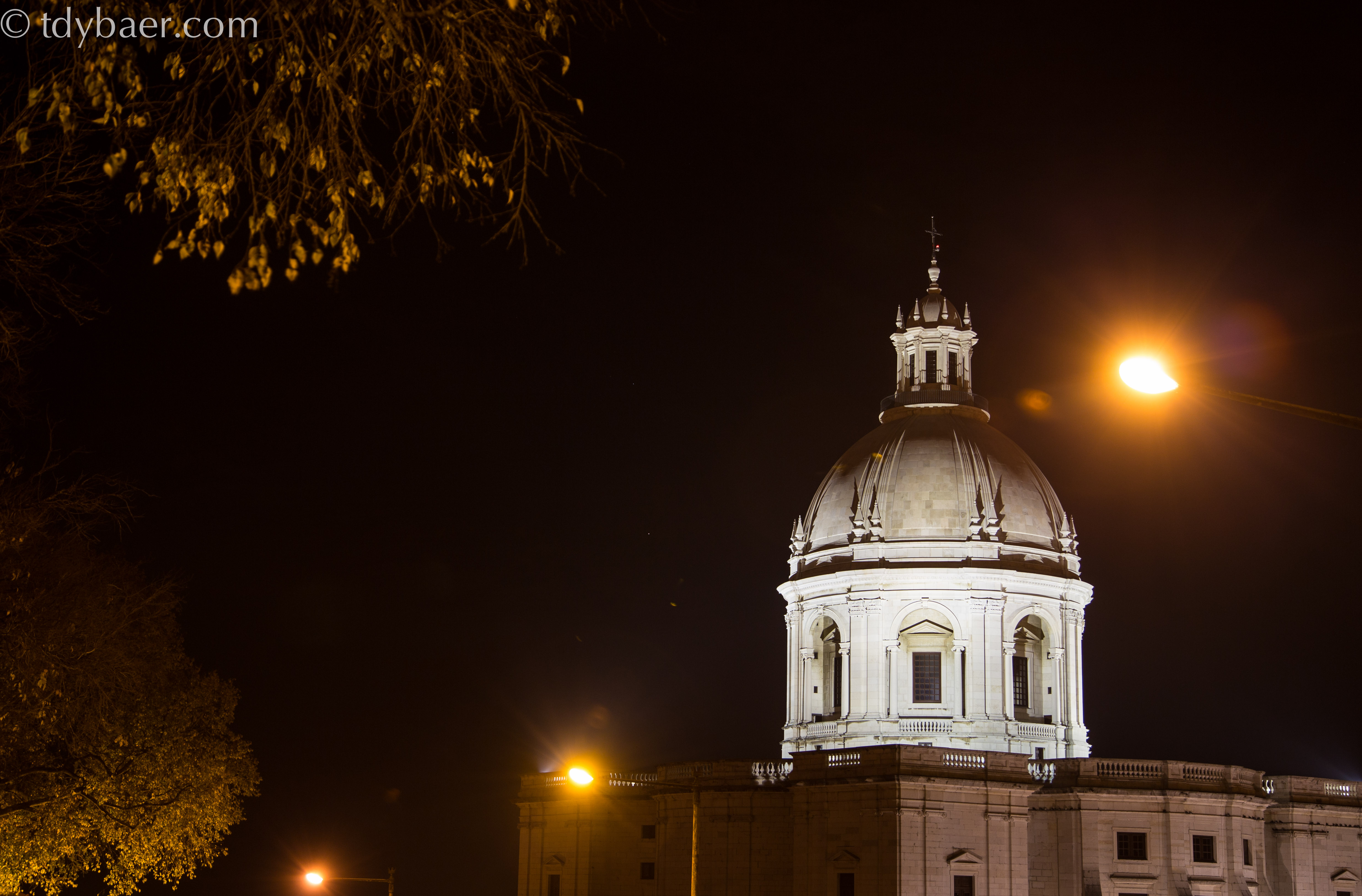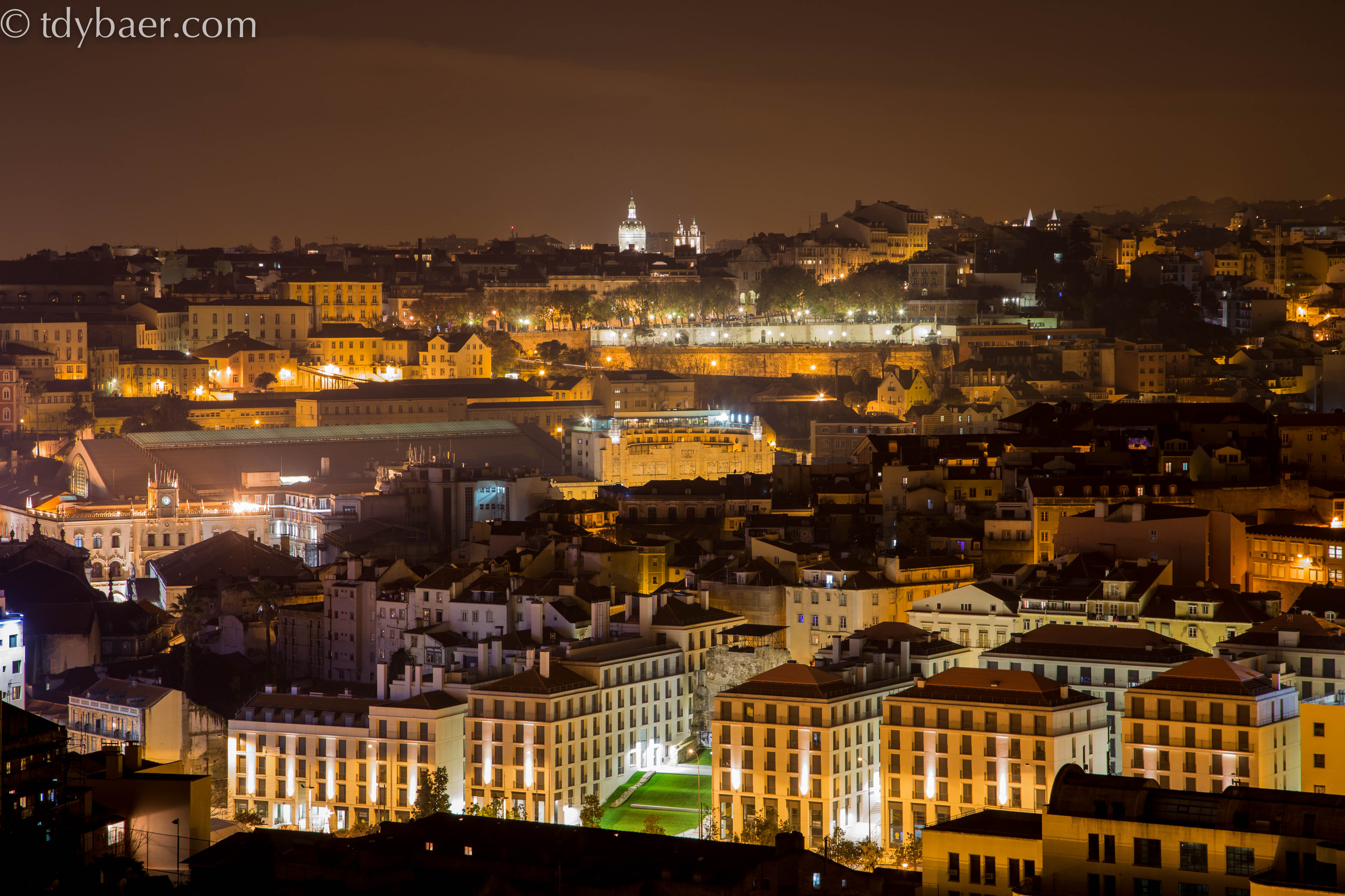 Wir packten das Stativ aus und machten es uns unter den Schirmpinien der Terrasse gemütlich. Die hell erleuchtete Kuppel im Hintergrund ist die Basilica da Estrela.