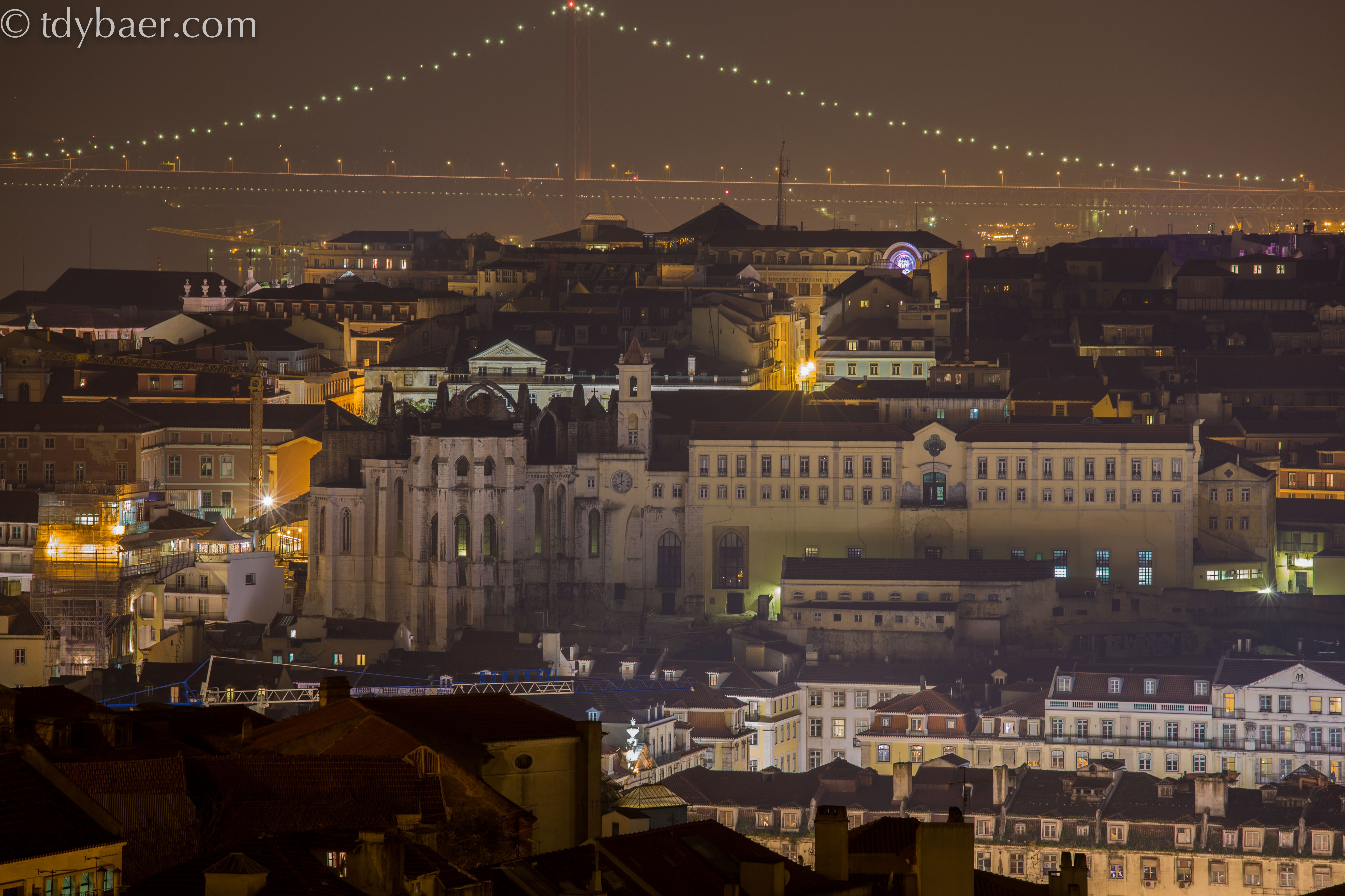 Unten im Bild sieht man links die beleuchtete Aussichtsplattform des Aufzugs Santa Justa mit der Karmeliterkirche. Dahinter erstrahlt die Brücke des 25. April.
