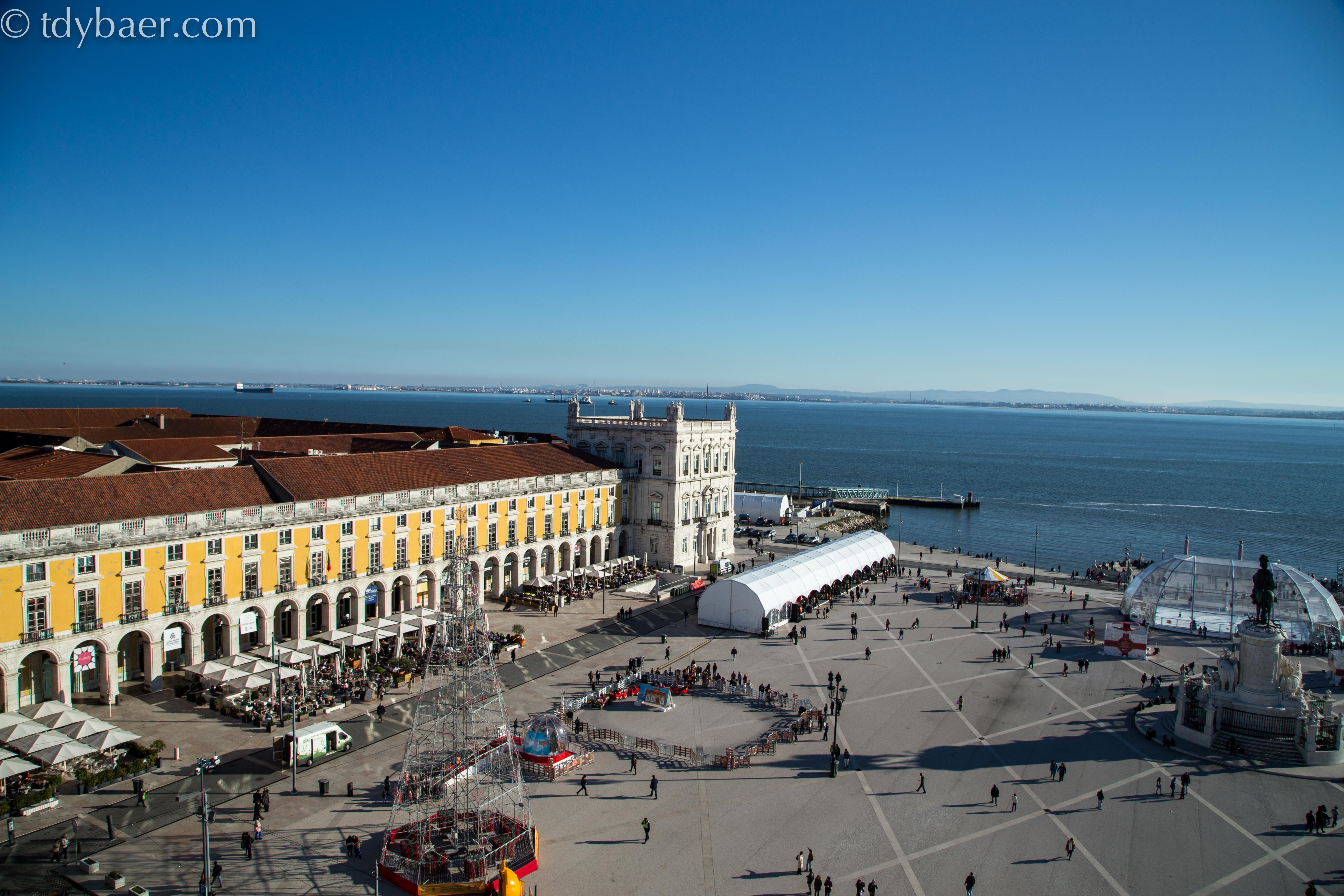 Auf dem Platz „Praca do Comercio“ ist noch der kleine Weihnachtsmarkt samt LED-Weihnachtsbaum und kleiner überdachter Eisfläche zu sehen.