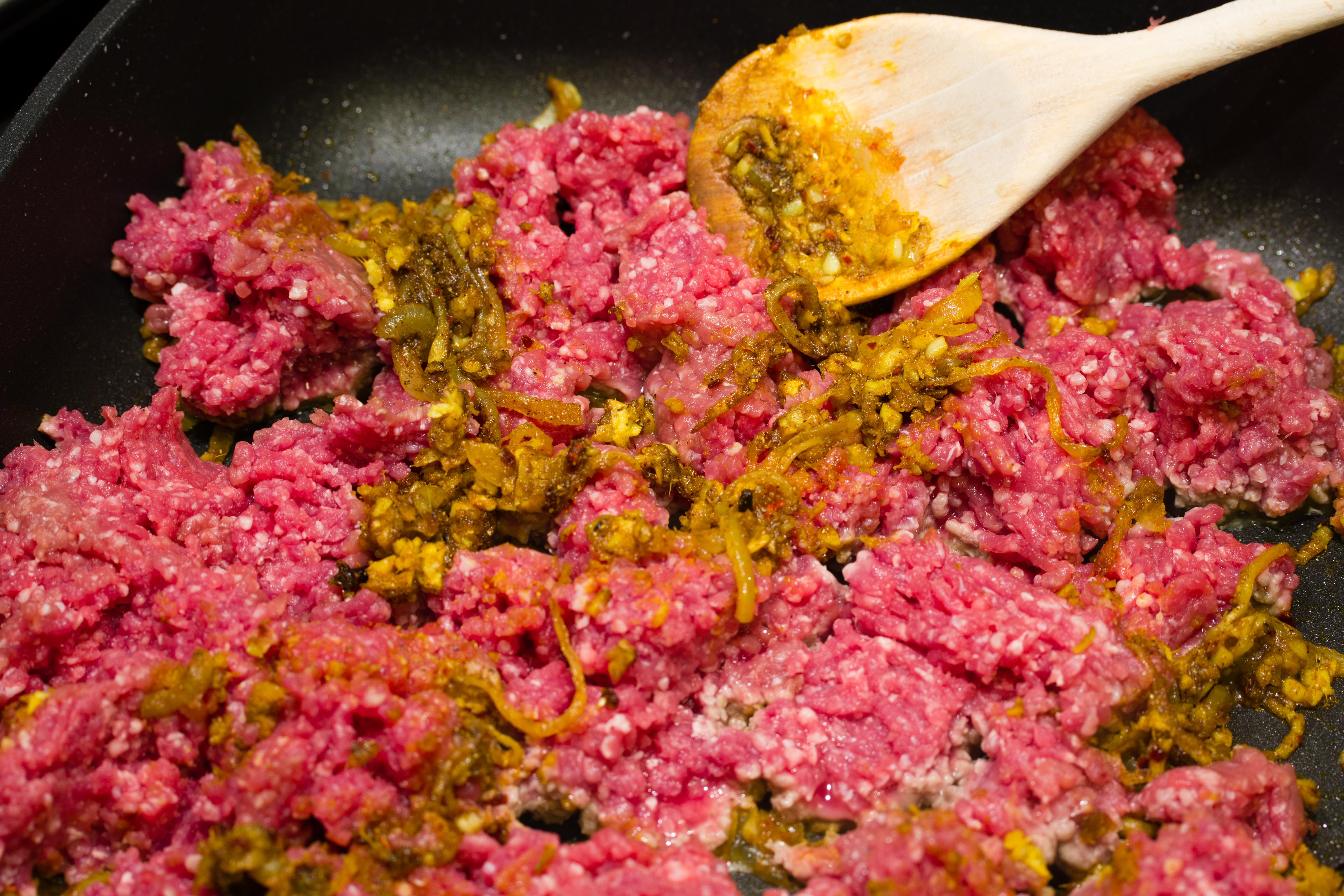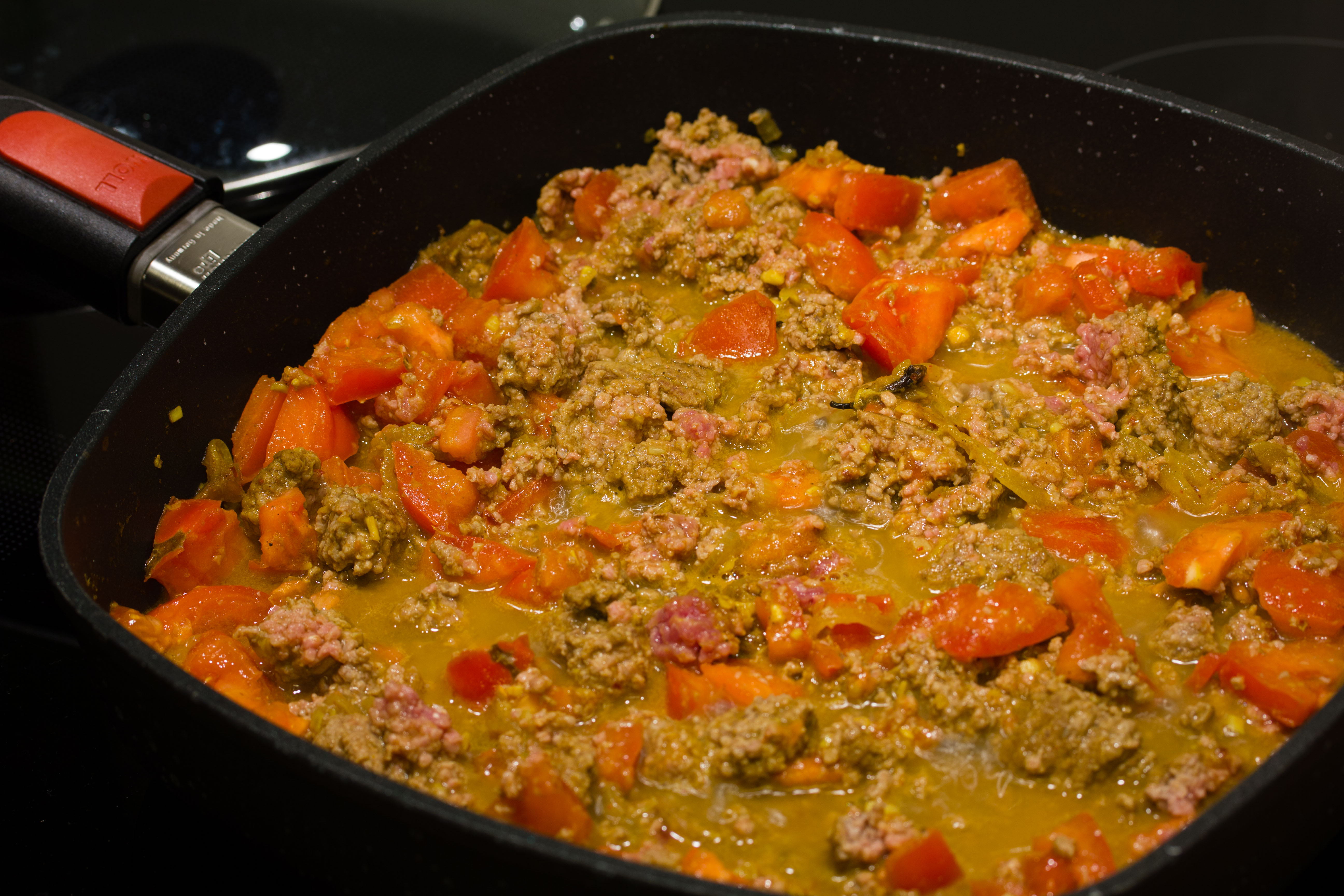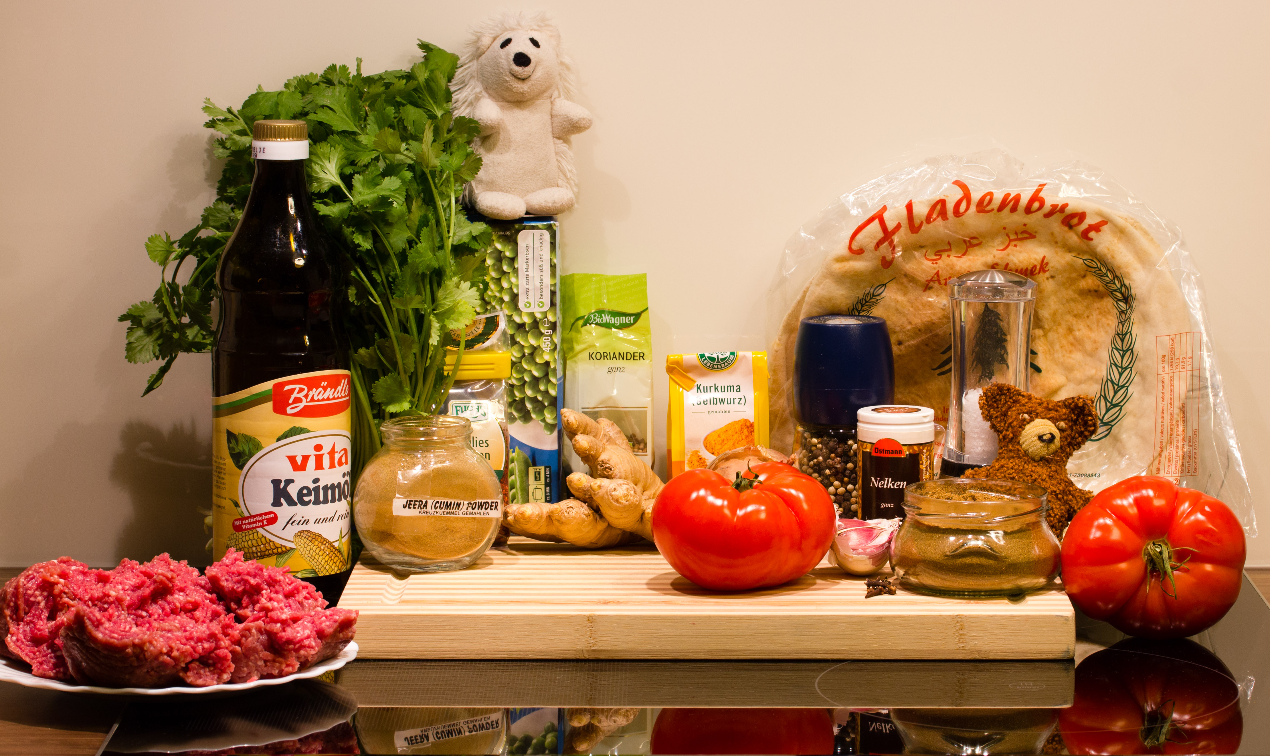 In einer großen heißen Pfanne werden zu erst die Zwiebelstreifen in etwas Öl angebraten, bis sie leicht braun werden. Danach gibt man noch einmal 1-2 Tl Öl in die Pfanne, lässt es kur heiß werden und streut dann den Kreuzkümmel, das Kurkuma- und Chilipulver sowie die Nelken in das Öl. Kurz warten bis das Öl die Gewürze „aufgesaugt“ hat und dann den Knoblauch und den Ingwer unterrühren. Alles zusammen mit den Zwiebeln verrühren. Jetzt kommt das Hackfleisch zum Anbraten mit in die Pfanne.