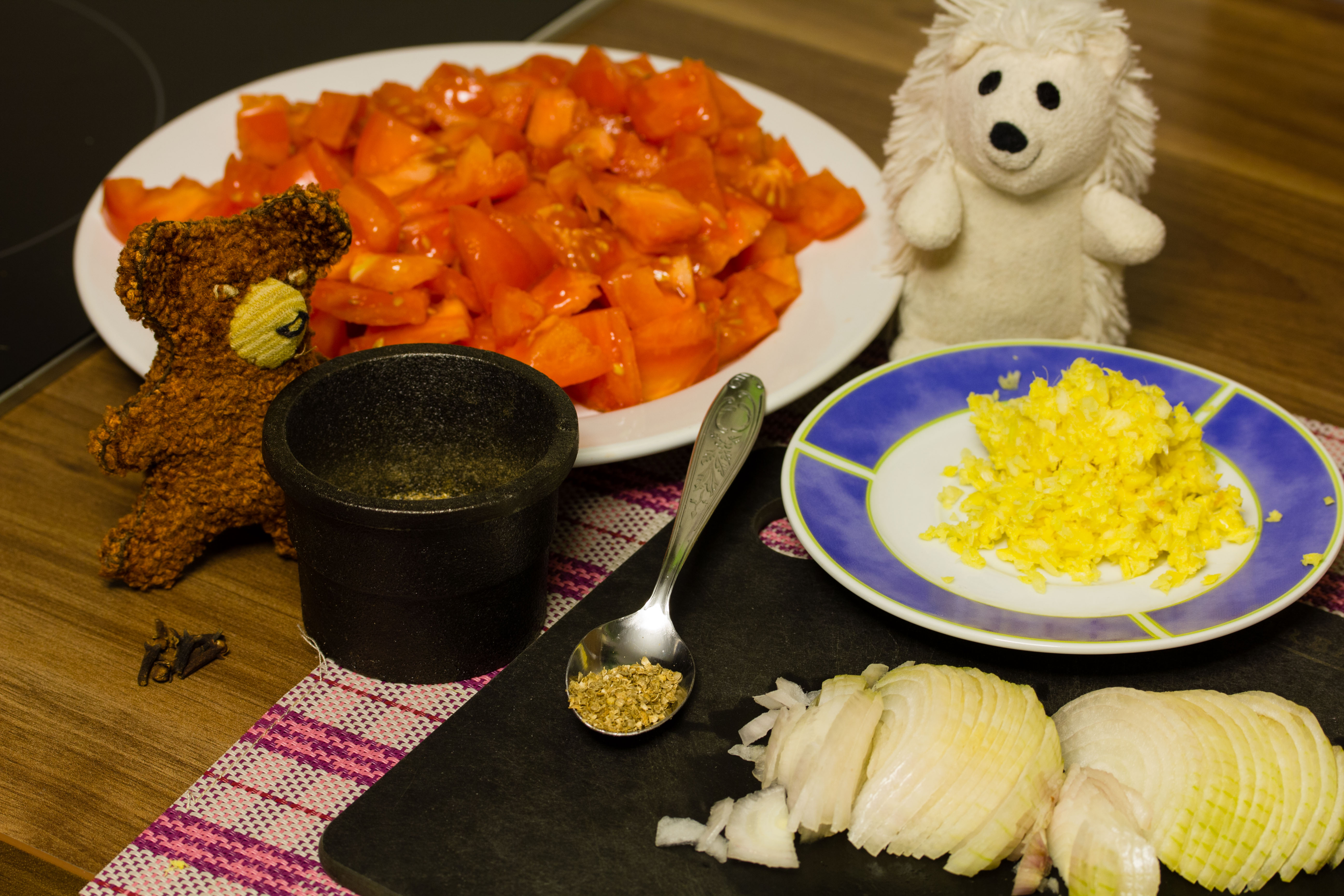 Kurz darauf die Tomatenstücke hinzugeben und mit Salz (3-4 Tl) würzen. Das Ganze etwa 10 Minuten braten und anschließend mit etwas Wasser ablöschen.