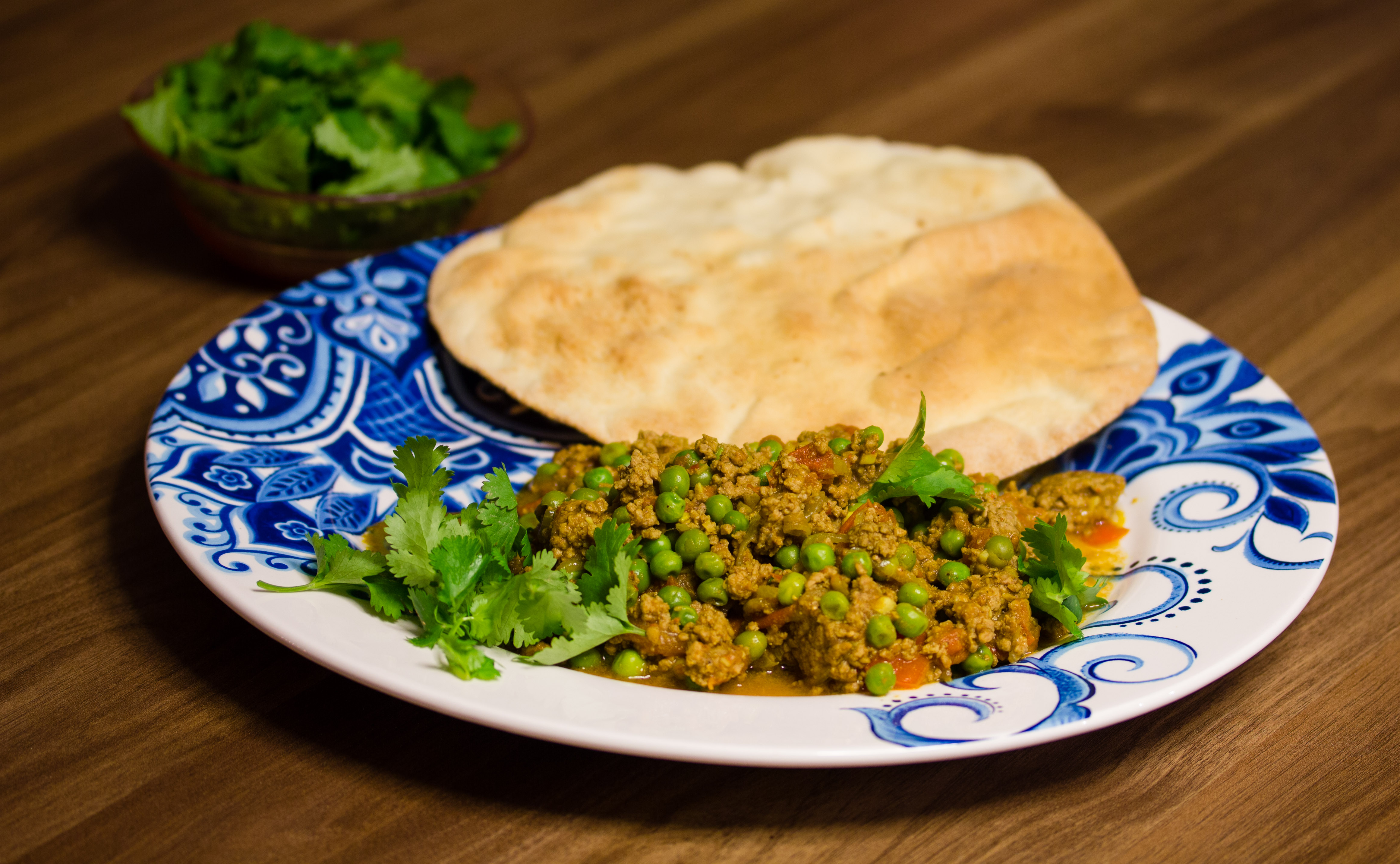 Jetzt kann das arabische Brot erwärmt und zusammen mit dem Keema Matar angerichtet werden. Das Gericht noch mit etwas Korianderpulver und frischen Koriander bestreuen und anschließend servieren.