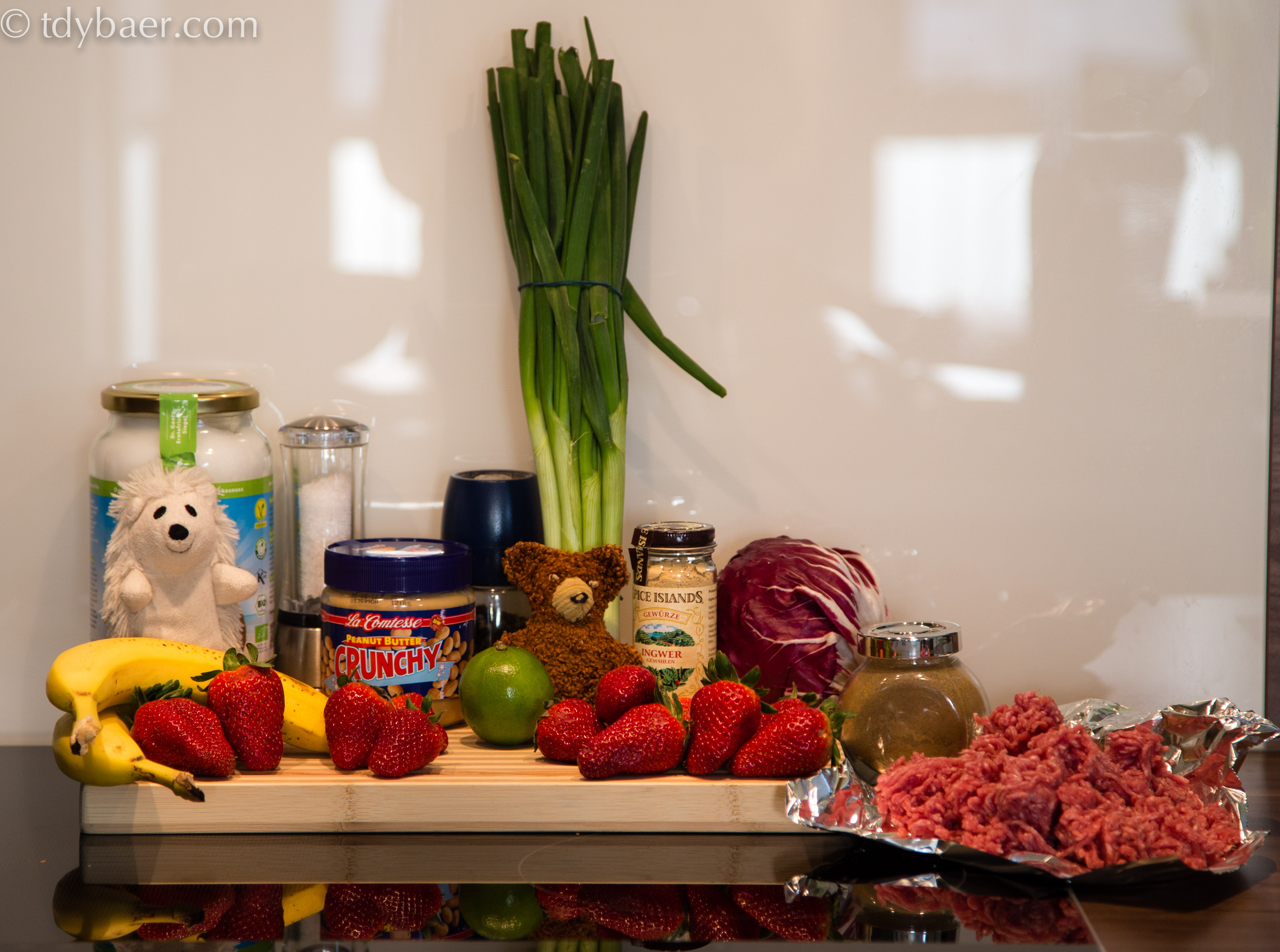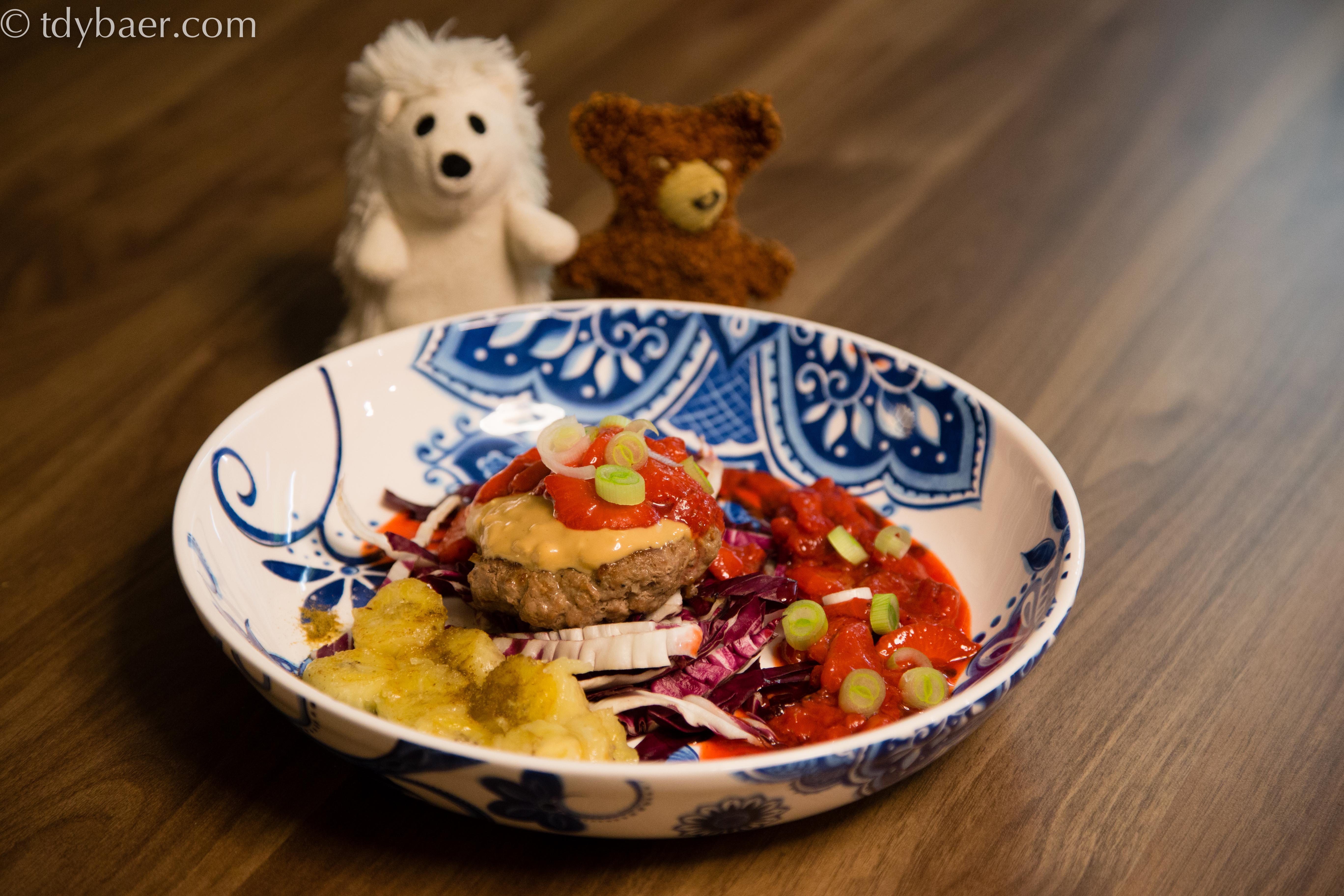 Heute weichen wir einmal von der Standardtomaten- oder Barbecue-Sauce ab, mit der gewöhnlich ein Hamburger garniert wird. Wir beglücken den saftigen Hamburger-Patty mit Erdnusscreme und gekochten Erdbeeren :-). Dazu etwas Salat und scharf angebratene Bananenscheiben, gewürzt mit Kreuzkümmel.