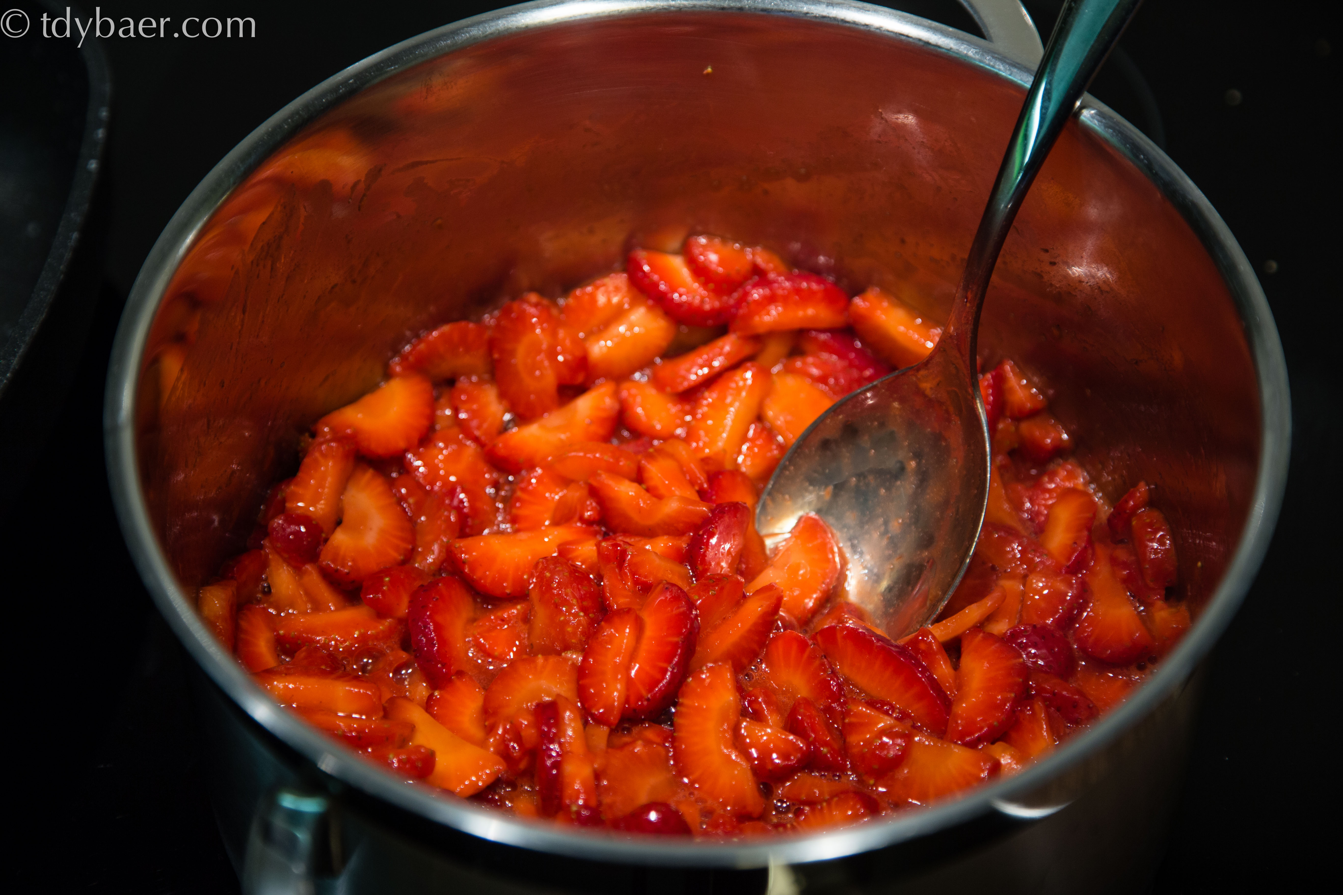 In der Zwischenzeit wird das Hackfleisch in einer Schüssel kräftig mit Salz und Pfeffer gewürzt, anschließend 4 gleich große Klopse formen. Wenn die Erdbeeren durchgezogen sind, erhitzt man sie in einem großen Topf und lässt sie leicht vor sich hin schmoren bis sie weich und leicht syrup-artig sind.