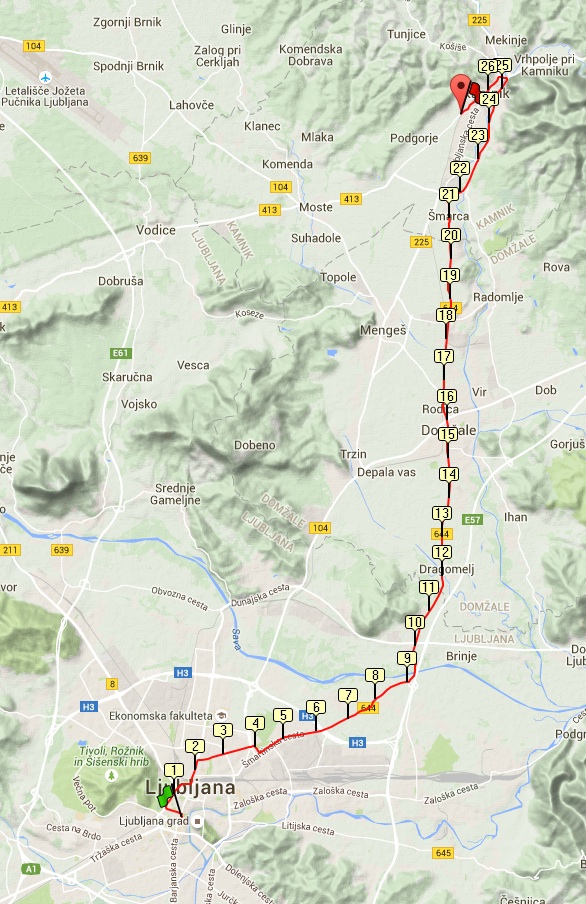 Um 13 Uhr mitteleuropäischer Zeit startete weltweit der Lauf in 35 Städten. Nach etwas über 10 km überholte das Catcher Car den Tdy und der sportliche Eisigel schaffte ganze 27 km in 2:16 h! 🙂 Der Weg Richtung Norden führte ihn wieder ins schöne Kamnik, das wir gestern besucht hatten.