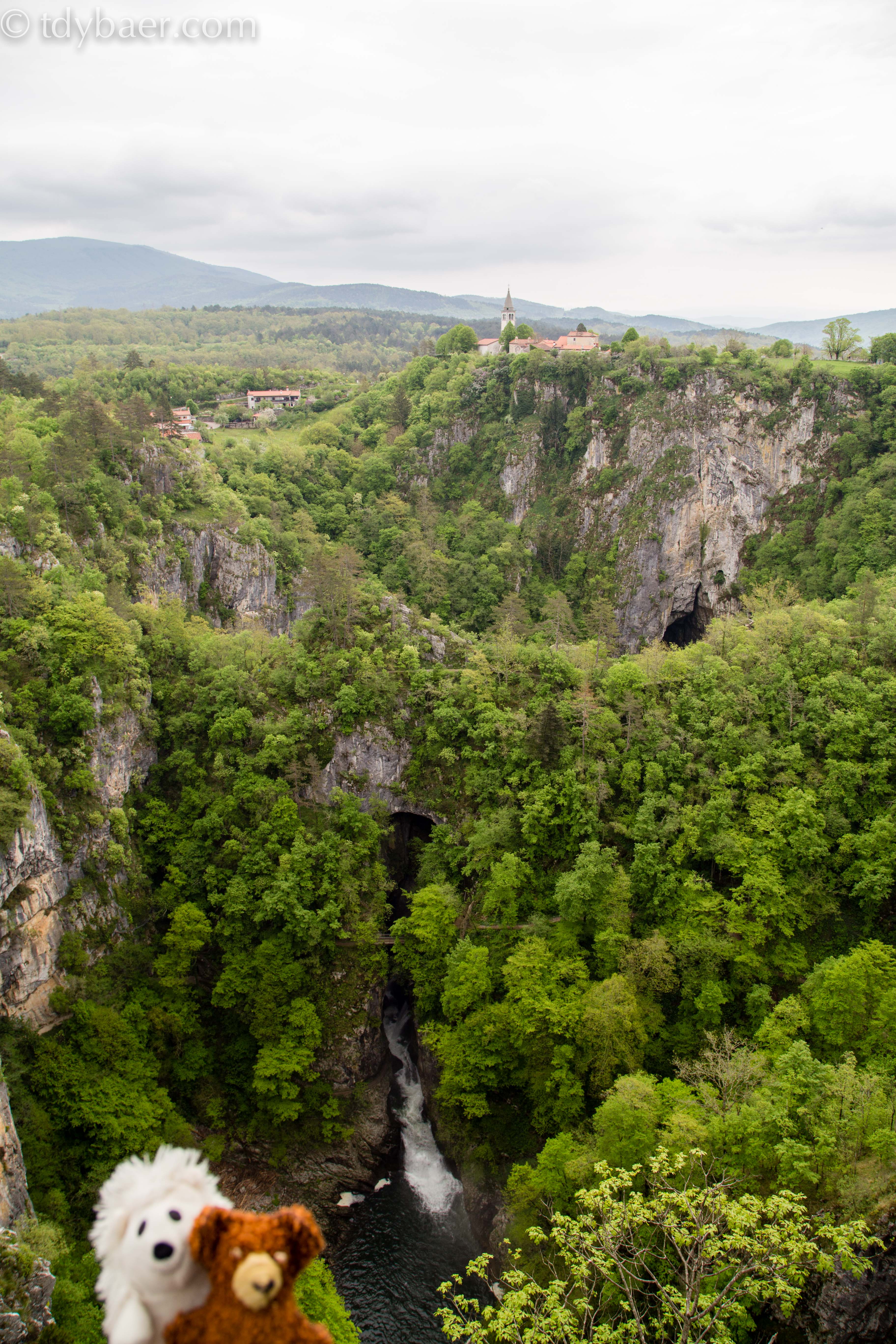 An der Ticketkasse muss man sich entscheiden, ob man eine Tour durch den unterirdischen Canyon der Reka machen möchte, oder man ergänzend auch noch ein paar weitere Höhlen mit Tageslicht besuchen möchte mit einem ebenfalls unterirdischen Wasserfall. Wir entschieden uns für beide Touren. Los ging es mit der Tageslicht-Tour durch die Mahoric- und die Marinier-Höhle. Wir man am unteren Bild sieht liegen die Höhlen unterhalb des Dörfchens Skocjan.