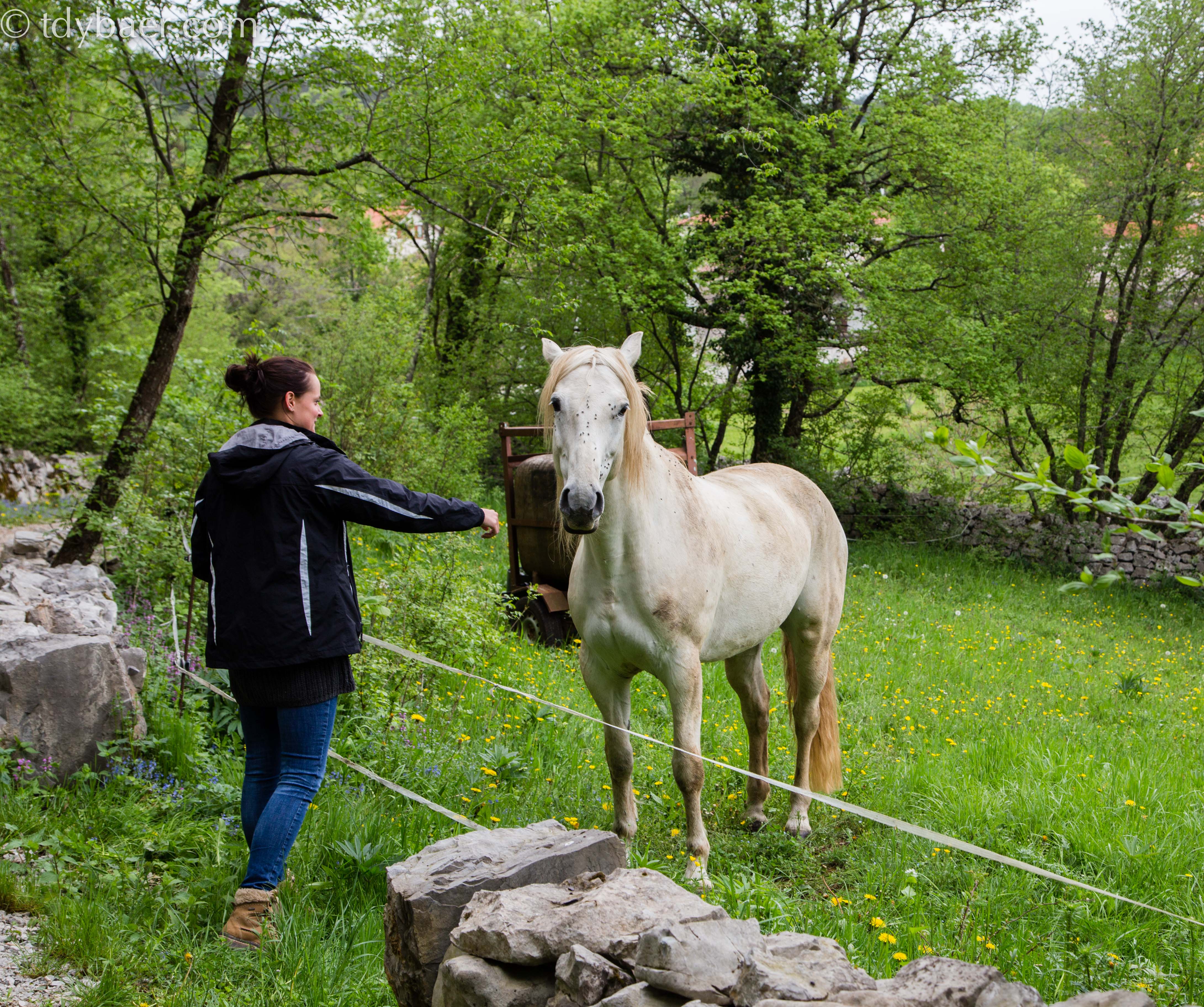 Um zum Eingang des Höhlensystems zu gelangen, geht es vorbei an saftigen Wiesen. Auf einer davon stand ein toller weißer Lipizzaner.