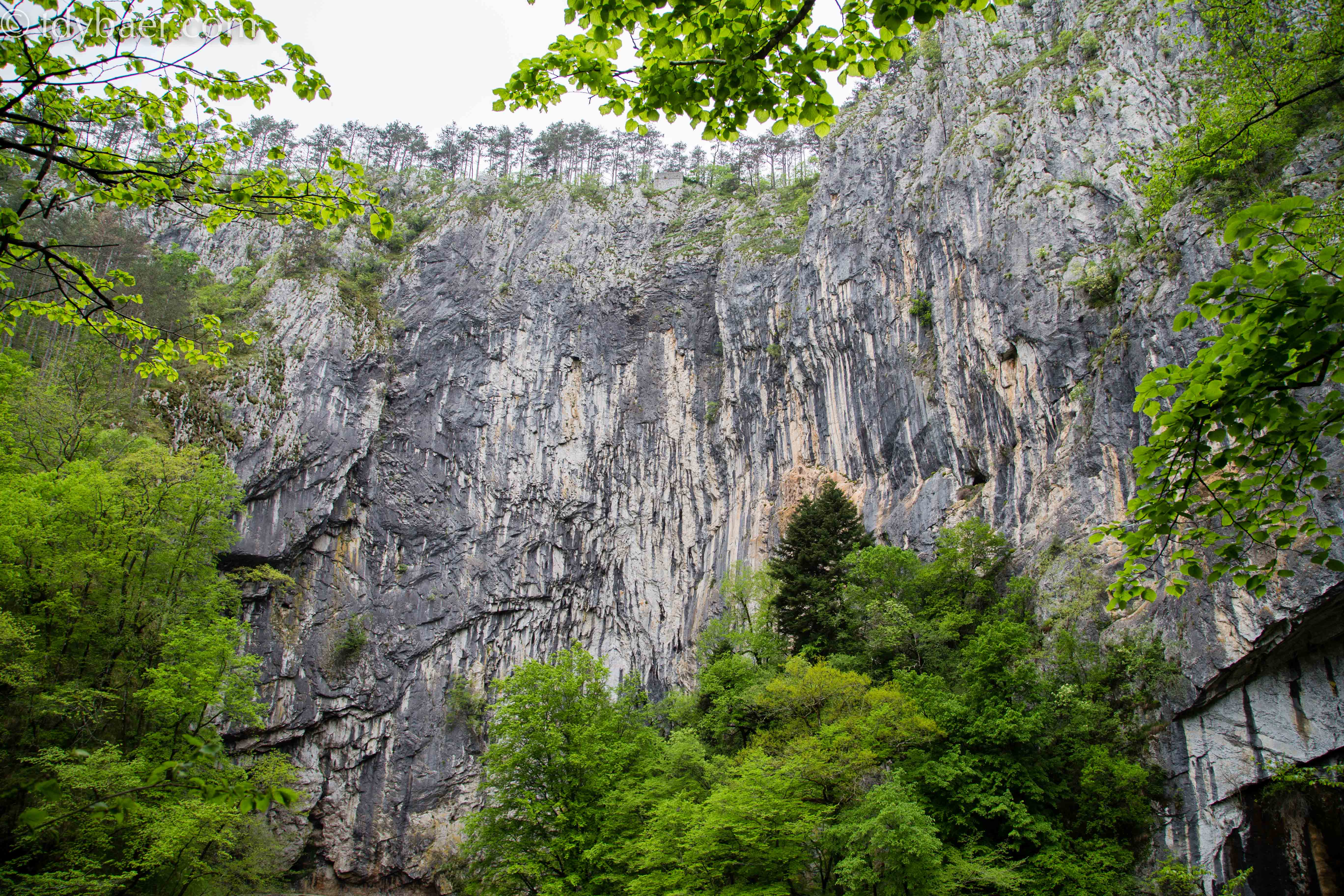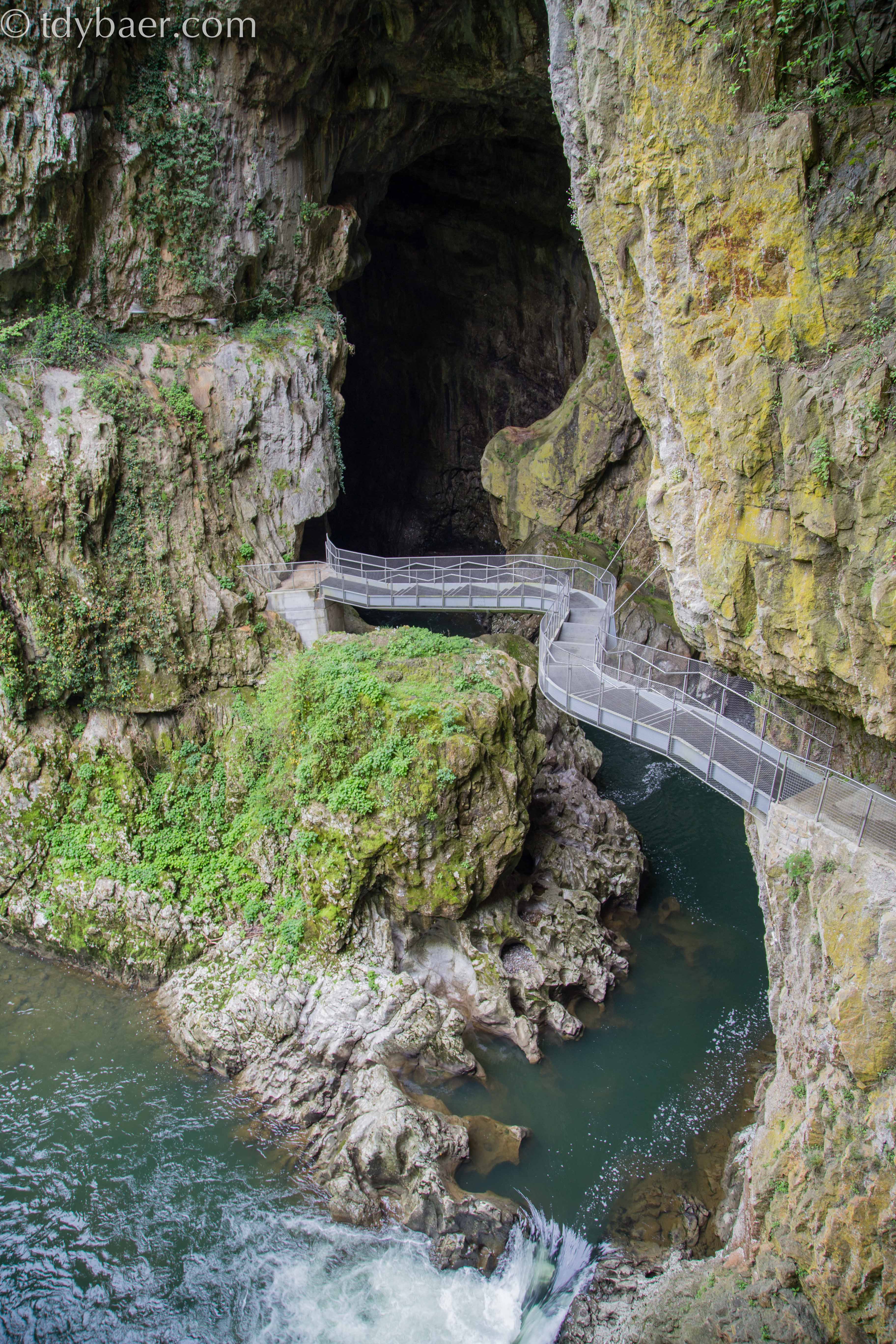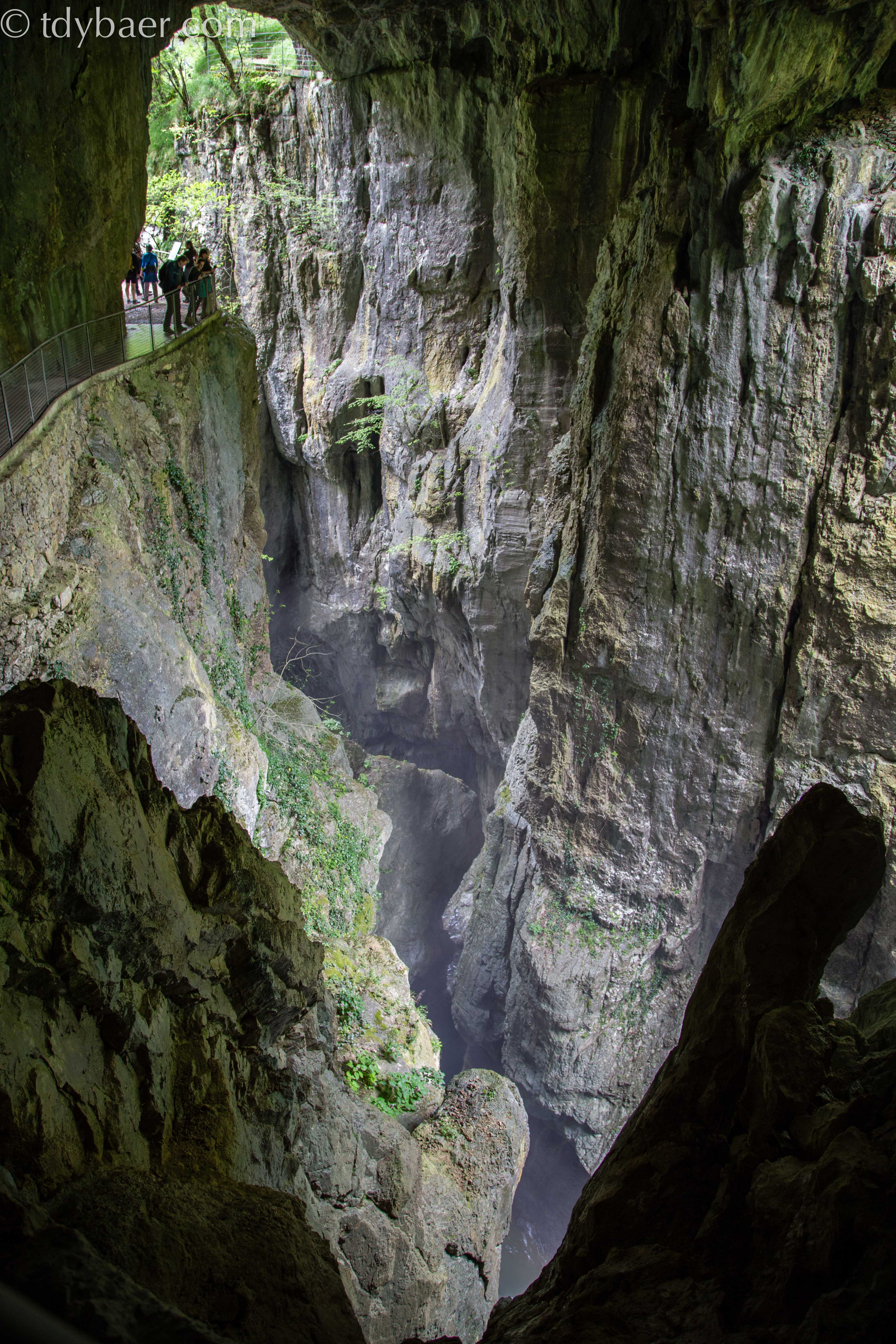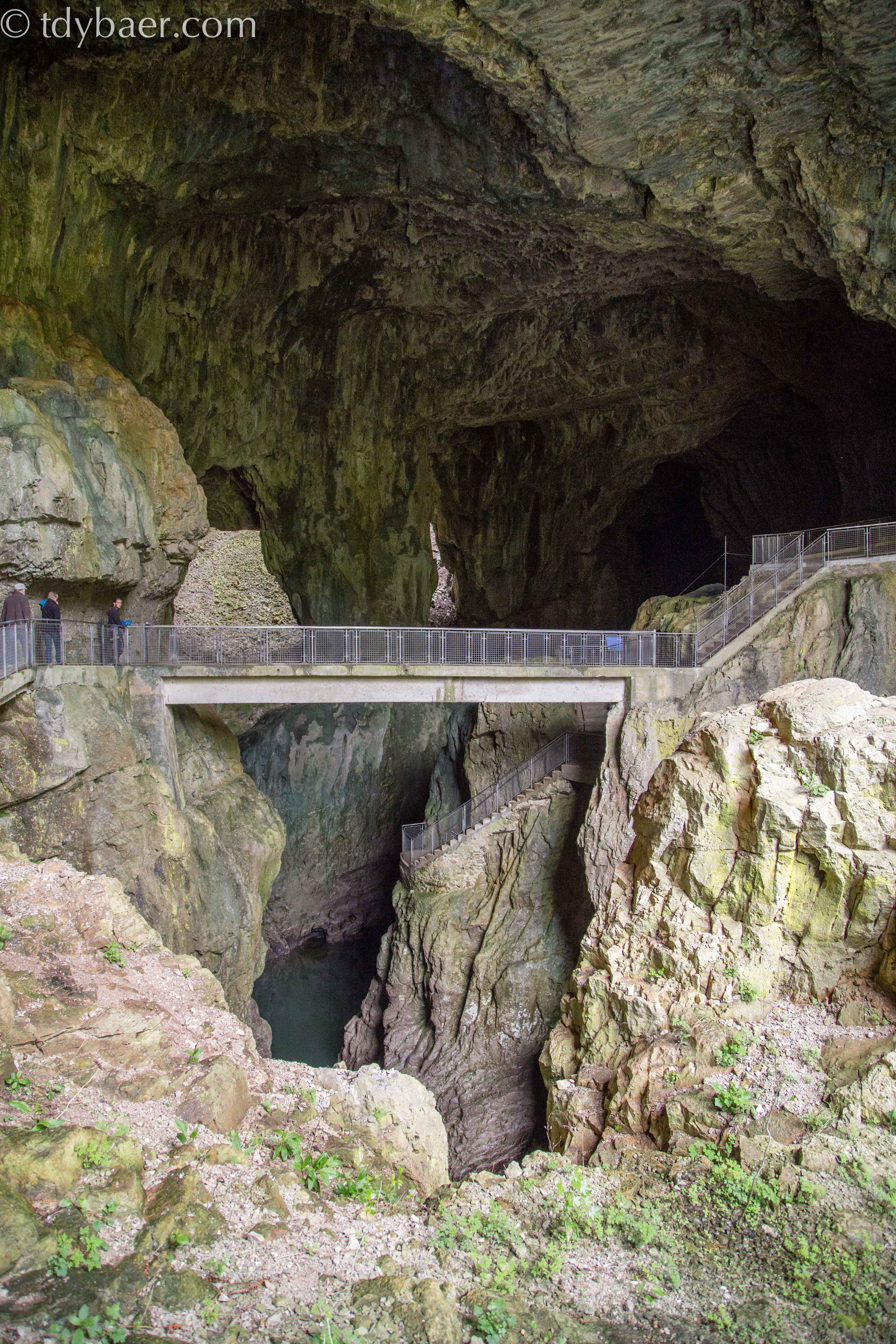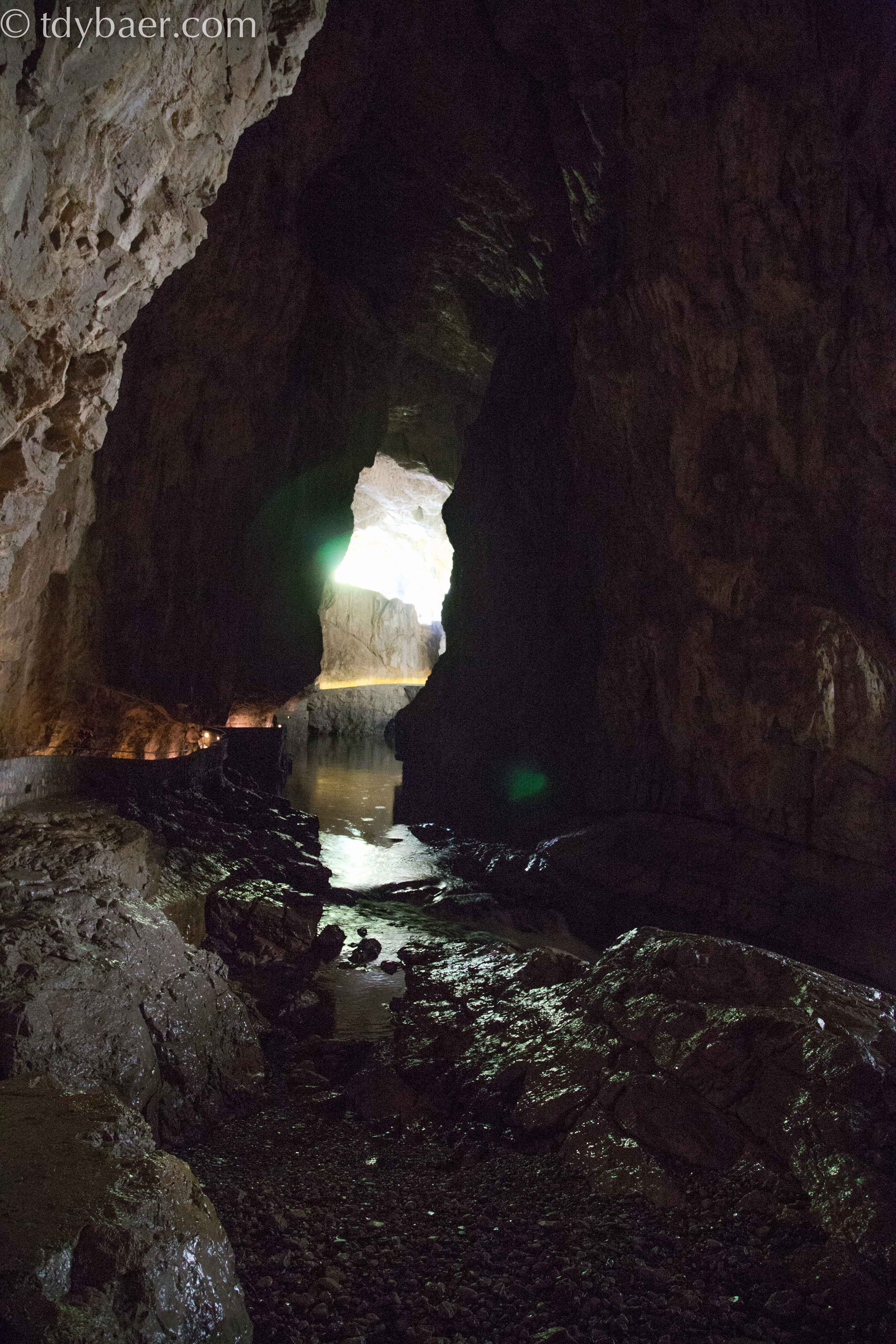 Die zweite Tour des Tages führt uns in das tiefe dunkle Innere und ist das eigentliche Highlight der Höhlen von Skocjan. Leider darf man keine Fotos machen und bei dem düsteren Licht macht das auch keinen Sinn. So viel sei gesagt: Einen unterirdischen 100 Meter tiefen Canyon haben wir vorher noch nie gesehen. Das ist echt der Wahnsinn. 🙂 Man hört den Fluss unten in der Tiefe bedrohlich rauschen und dank der Beleuchtung kann man sich in der zweistündigen Tour auch kaum satt sehen. Daumen hoch für diese tolle Höhle. Den Ausgang bei Tageslicht durfte man dann wieder knipsen.