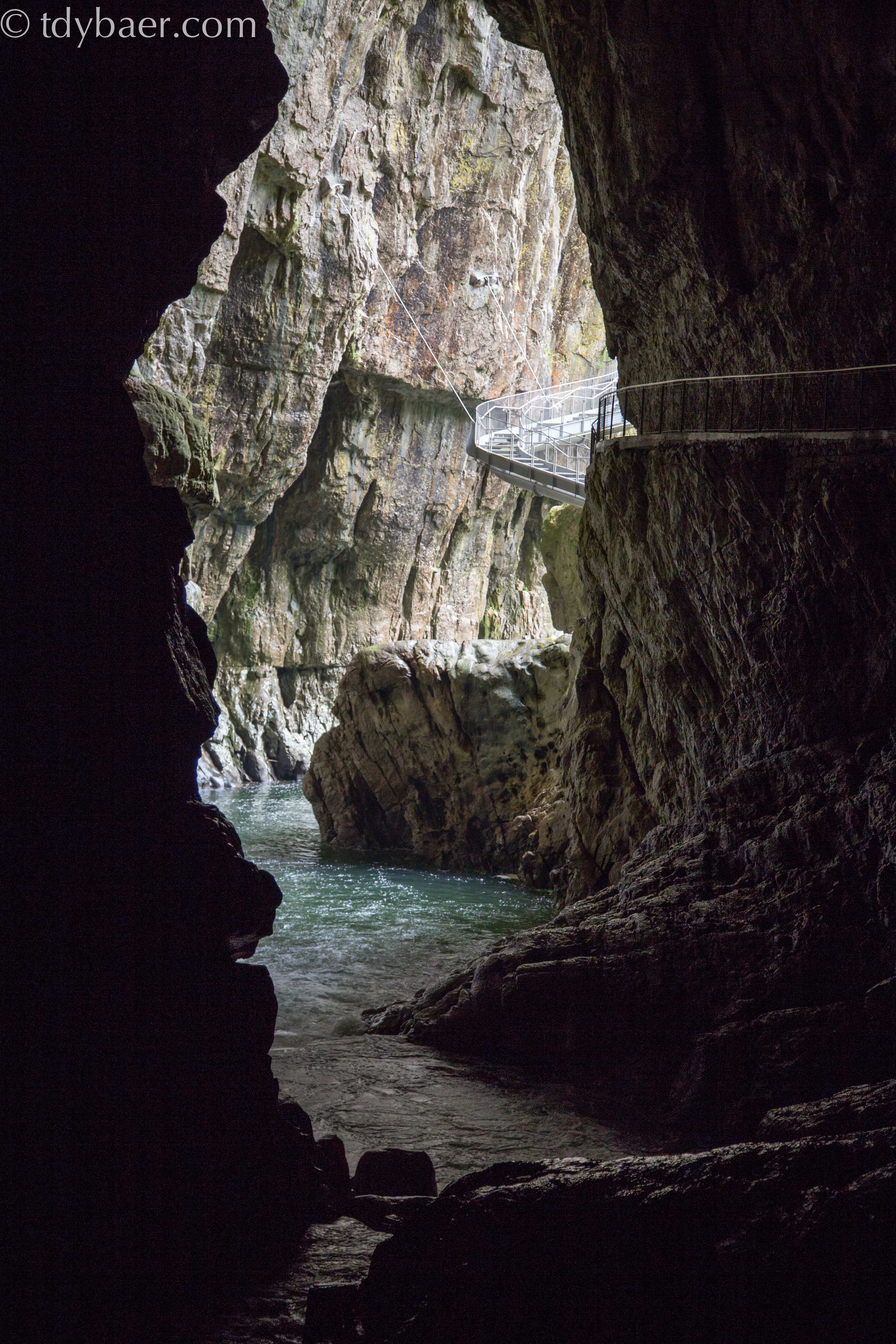 Der Fluss Reka schlängelt sich durch die Felsen und wir erreichen nach einem guten Stück wieder das Tageslicht.