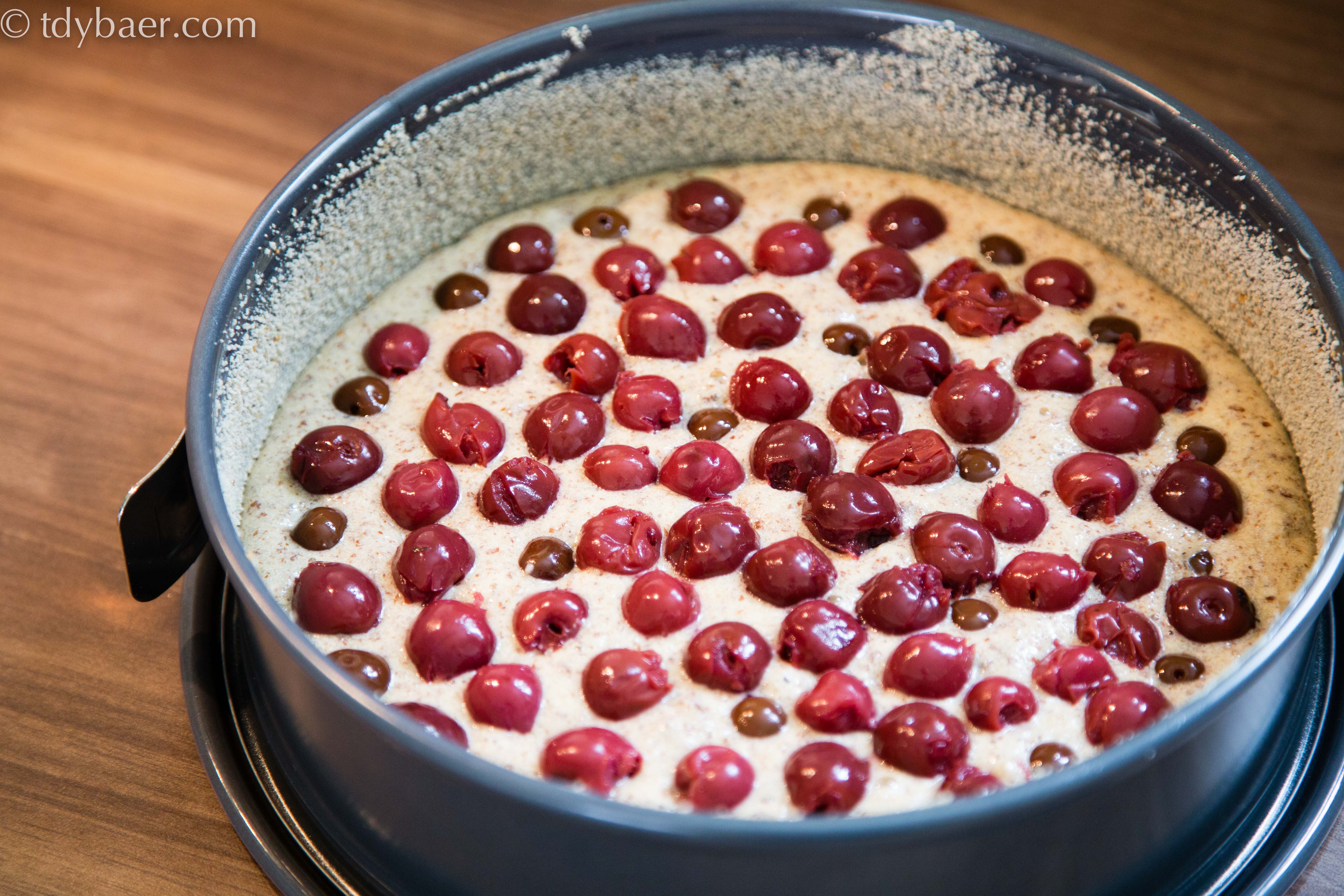 IMG_3394 Zu Beginn werden die Eier getrennt. Das Eigelb zusammen mit dem Zucker eine gute Weile rühren bis es schaumig wird. Anschließend das Kirschwasser und den Grieß dazugeben. Falls die Masse zu fest wird, noch etwas mehr Flüssigkeit dazugeben, so dass sich die Grießmasse rühren lässt. Anschließend das Eiweiß steif schlagen und die geriebenen Mandeln unterheben. Den Backofen auf 180° Ober-/Unterhitze vorheizen. Nun die Eischnee-Mandelmischung mit der Ei-Grießmasse vorsichtig vermengen.IMG_3396 Die Hälfte des Teiges in die Springform füllen und reichlich mit Kirschen belegen. (Nach dem Foto kam noch der Rest der Kirschen auf den Kuchen 🙂 ).IMG_3398 Nun den Teig auf den Kirschen verteilen und ab damit in den Ofen für ca. 35 bis 45 Minuten.IMG_3402 Das sieht doch schon einmal gelungen aus. IMG_3403 Nach dem Abkühlen musste der Kuchen natürlich auch noch angeschnitten und ein Stück verköstigt werden. Schmeckt sehr lecker.IMG_3409 Dank des Grieß versinken die Kirschen auch nicht so tief im Kuchen. Der Kuchen braucht viele Kirschen, damit er schön saftig wird. IMG_3420 Nachgebacken aus:  Servus in Stadt und Land / Ausgabe Juli 2015