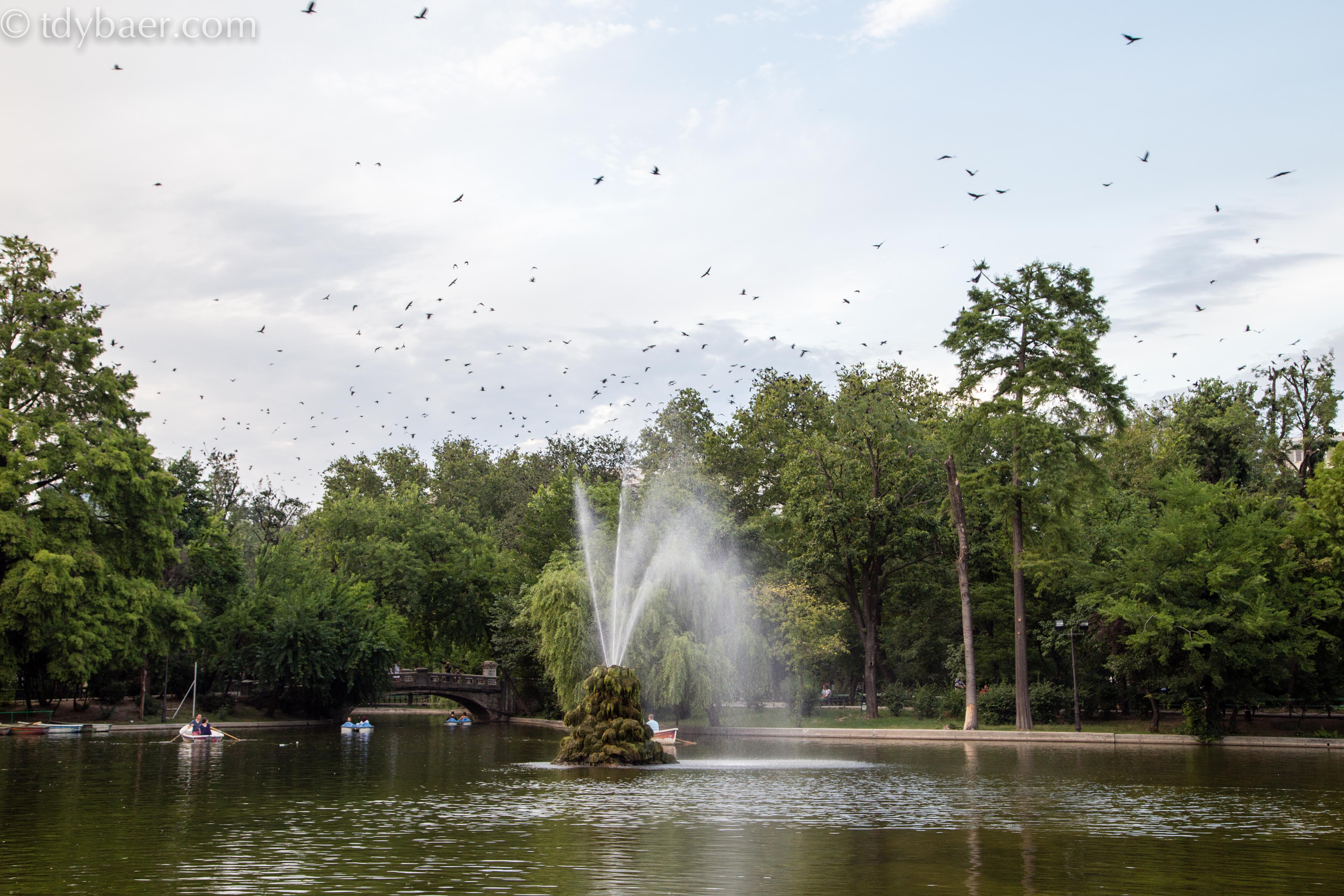 Wir spazierten weiter und erreichten irgendwann ein Eis schleckend den Gradina Cismigiu. Dieser Park ist durchzogen von einem großen Gewässer mit kleinen Kanälen, auf denen man Boot fahren kann. Erstaunlich waren die vielen Krach machenden Vögel, die immer in großen Scharen von Baum zu Baum flogen und doch so einiges an Dreck hinterließen ;-). Wir machten es uns dann im nördlichen vogelfreien Teil des Parks an einem Kiosk mit einem Gute-Nacht-Bierchen gemütlich und planten schon einmal den nächsten Tag :-).