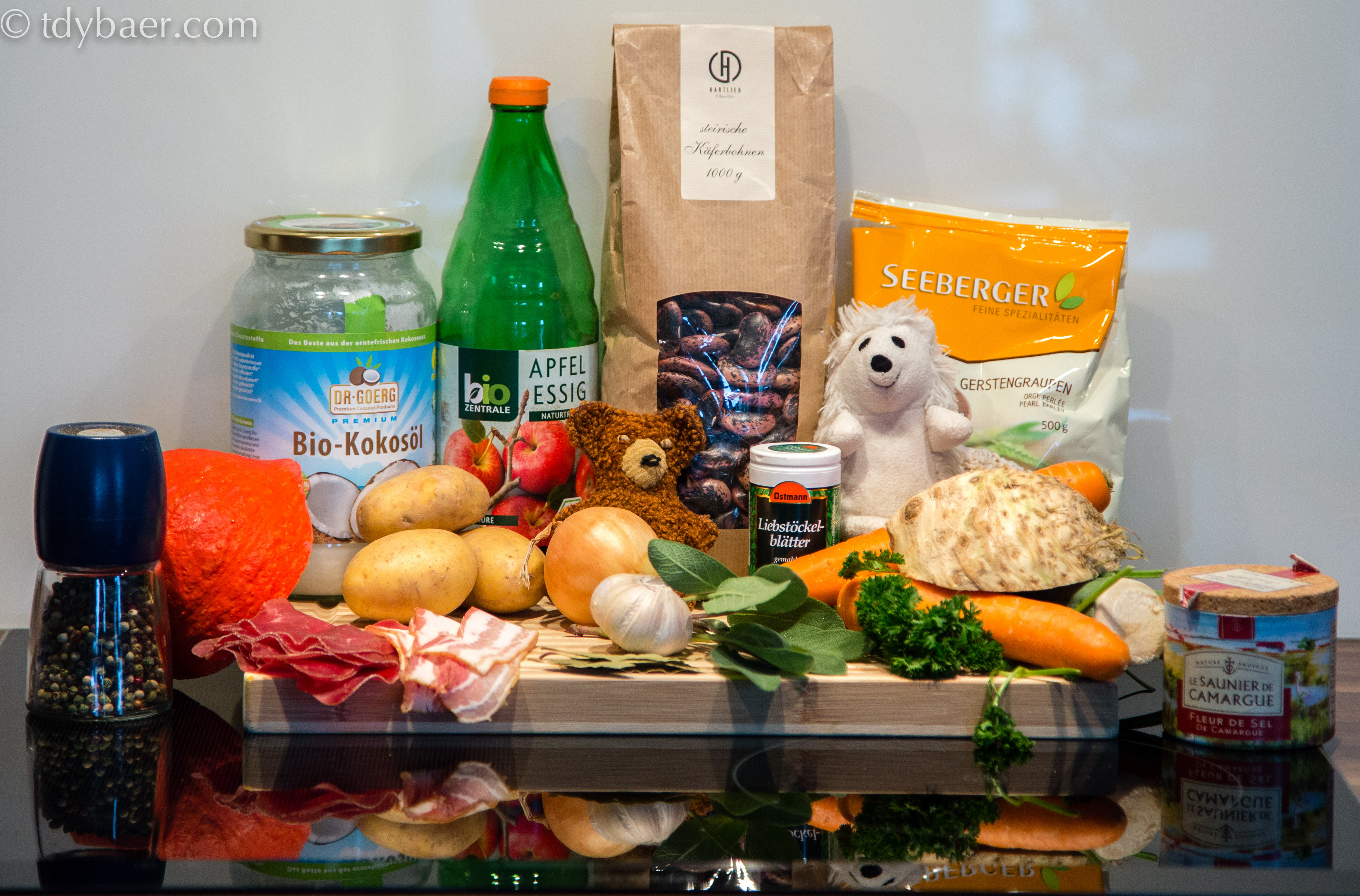 Am Abend vorher nicht vergessen die Bohnen und auch die Graupen in Wasser einzuweichen. Die Graupen hatte ich jedoch vergessen einzuweichen, so dass sie nur 1h im Wasser lagen. Sie sind aber auch weich geworden, allerdings habe ich 2 L Gemüsebrühe für den Eintopf benötigt.