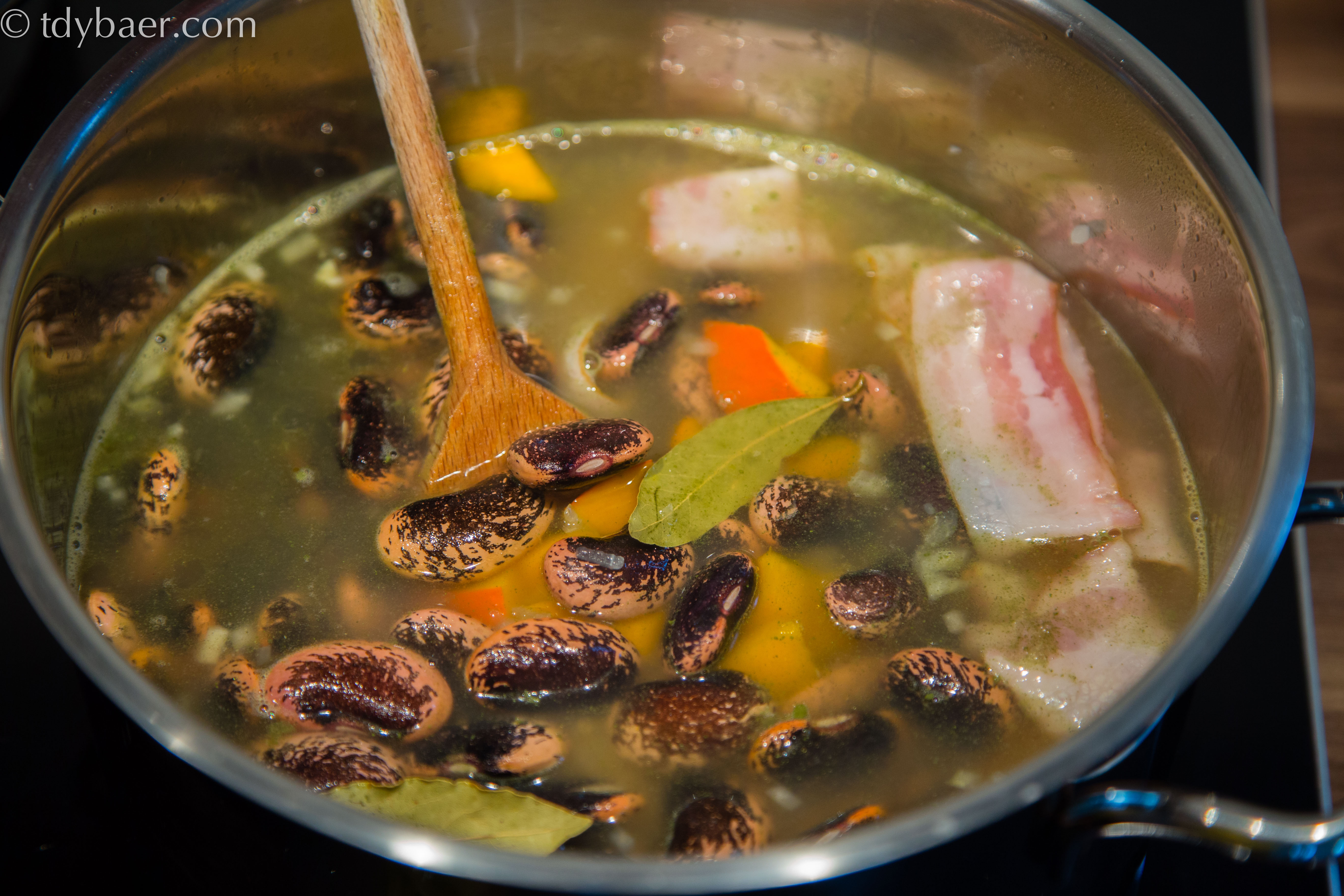 Jetzt kommen die abgetropften Bohnen und Graupen in die Brühe und dazu dann noch der Lorbeer, Liebstöckel und die Schwarte. Das Ganze muss jetzt zu Beginn für eine Stunde köcheln.