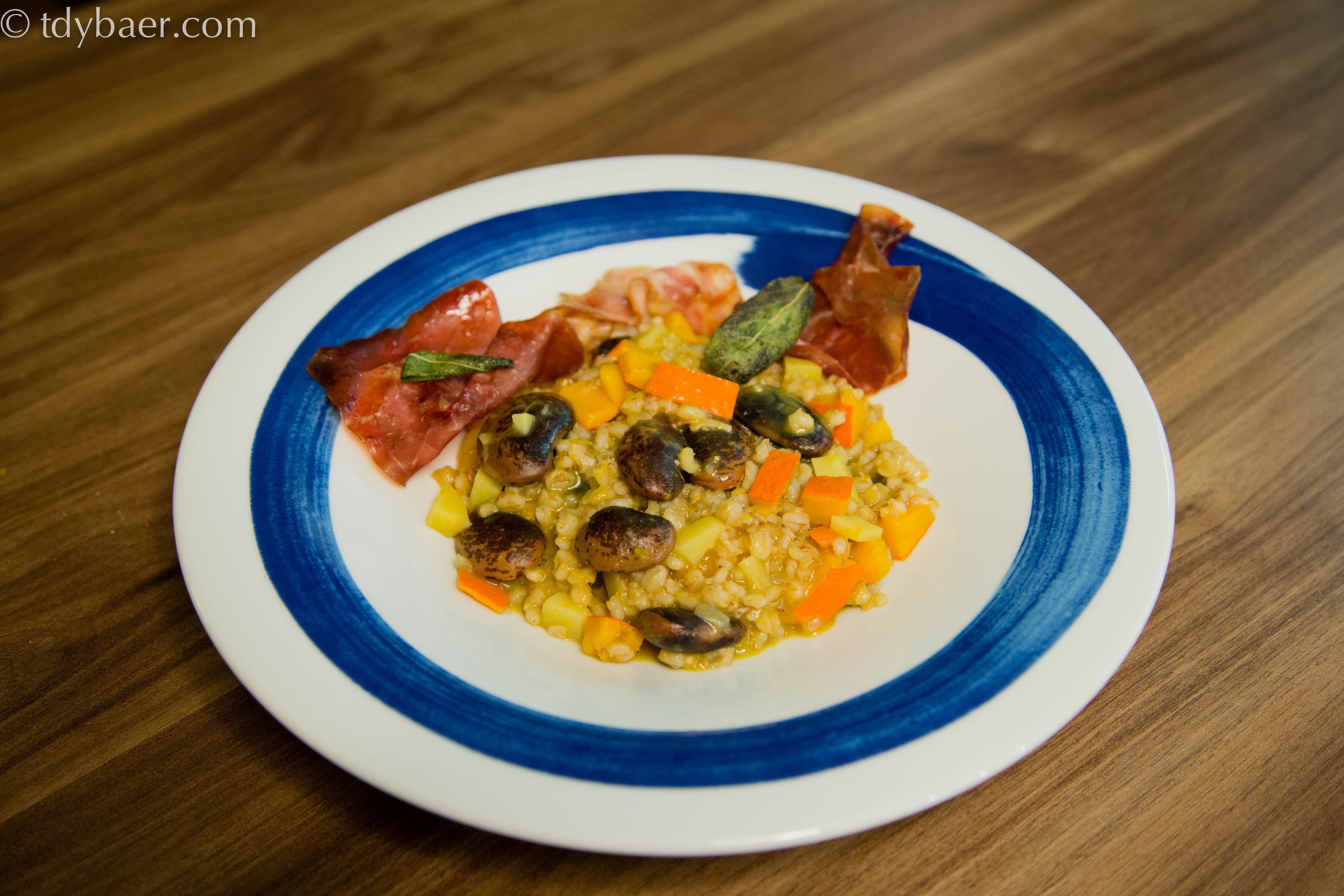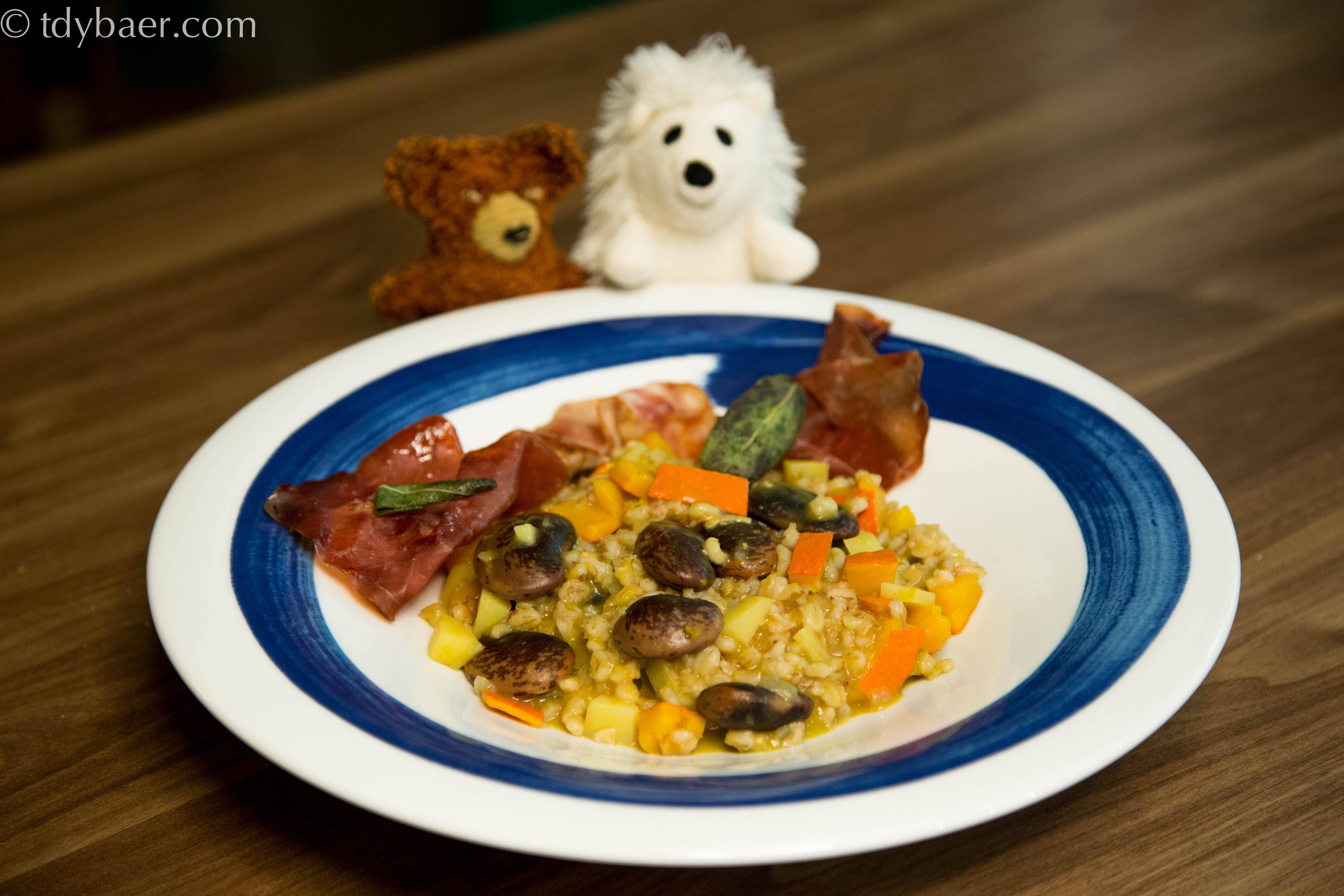 Zur Einstimmung auf einen farbenfrohen Herbst gibt es heute einen leckeren bunten und wärmenden Eintopf. Die großen lila-gescheckten Bohnen sind Käferbohnen, die ich eigens für dieses Rezept erstanden habe 🙂 – aber man kann natürlich beliebig andere Bohnen verwenden. Diese dicken Dinger benötigen aber in jedem Fall die 1,5 Stunden Kochzeit des Eintopfes und sind wirklich lecker. Dazu gibt es Graupen, Kürbis und knusprig angebratenen Schinken und Salbei.