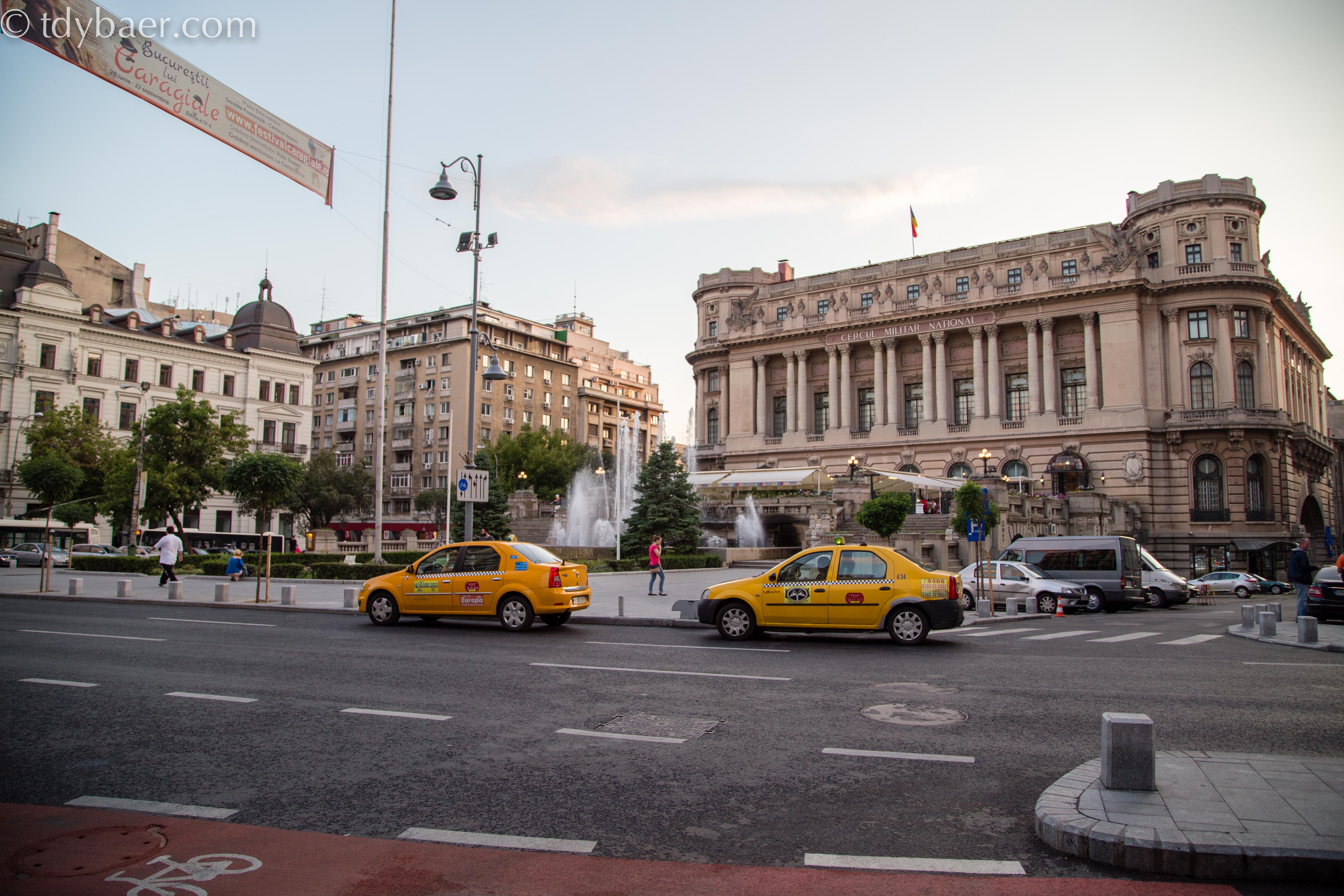 Nach einem kurzen Schauer konnten wir frisch gestärkt unsere Tour durch Bukarest zu Fuß fortsetzen. Wir kommen an der Piata Universitatii vorbei, der von drei Standbildern und einer Statue geprägt wird. In der Mitte des Platzes steht die Reiterstatue von Michael des Tapferen. Die drei Standbilder zeigen drei große Persönlichkeiten Rumäniens die sich auf dem Gebiet der Wissenschaft und des Gesellschaftslebens hervorgetan haben.