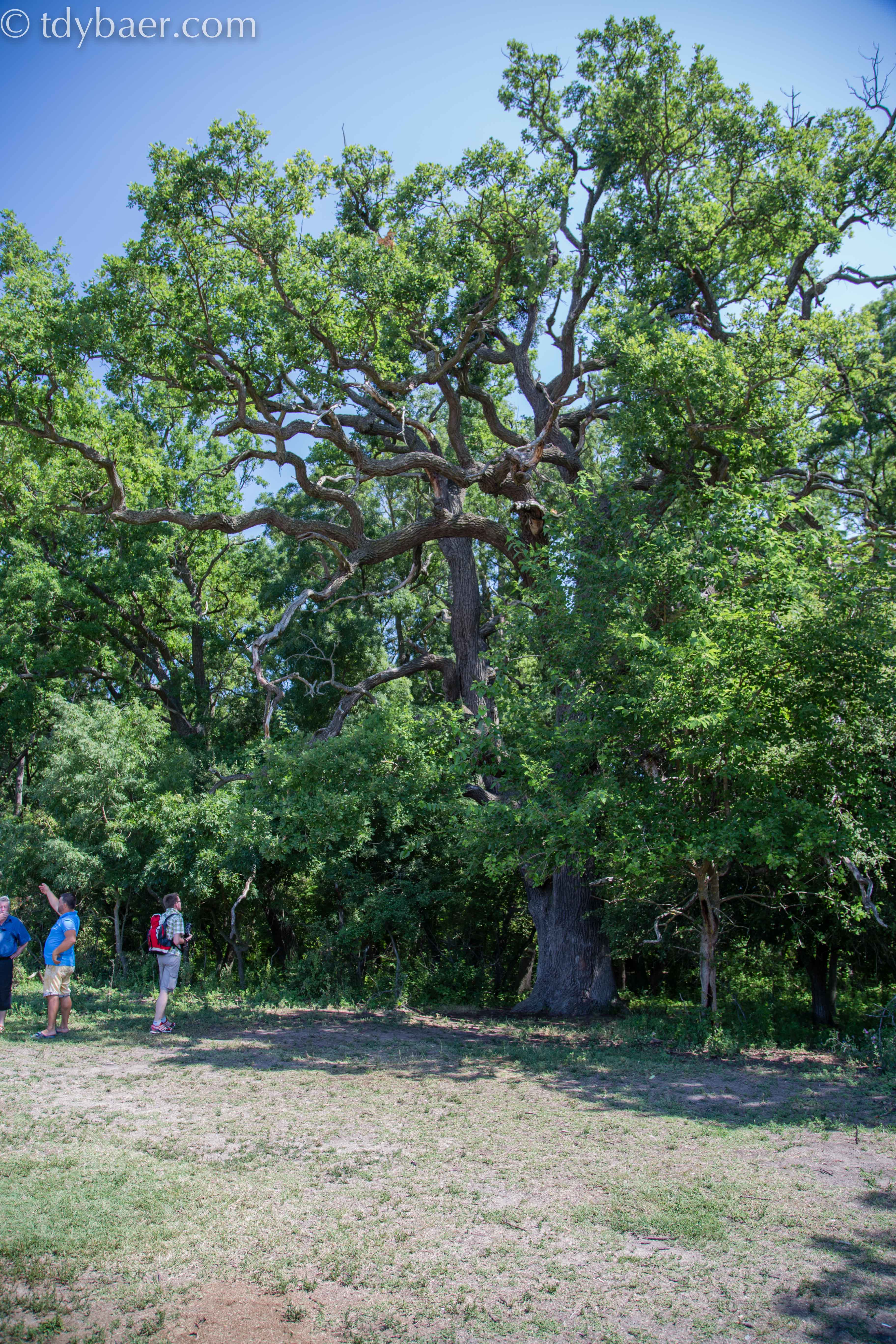 Nach einer Weile erreichten wir in einem abgesperrten Reservat einen Wald mit vielen alten knorrigen Bäumen – u.a. mit einer sehr alten Steineiche unten im Bild – die trotz des sandigen Bodens und der Trockenheit im Sommer hier prächtig gedeiht. Im Wald gibt es jede Menge Schlingpflanzen und Lianen, an denen man sich hin und her schwingen kann.