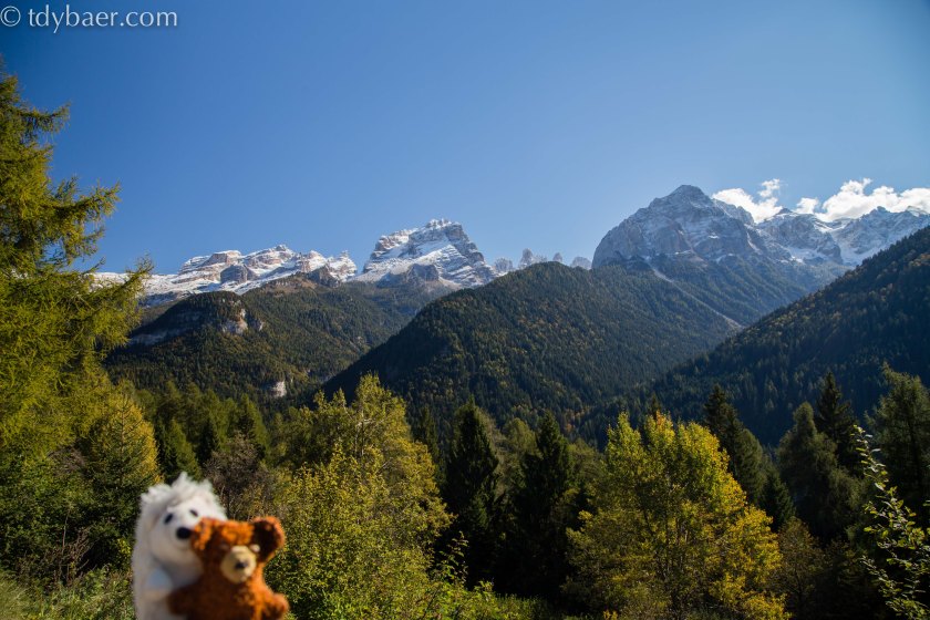 Das schöne Wetter kam heute wie bestellt zu unserer Tour rund um das Brenta Gebirge. Unsere Unterkunft in Dorsino liegt genau auf dieser Rundtour, so dass wir gleich im Uhrzeigersinn starten konnten. Vorher aber noch einmal der tolle Blick von unserem Parkplatz aus in Richtung Norden. Heute waren die vielen Wolken verschwunden und wir konnten die tolle Bergwelt bewundern.