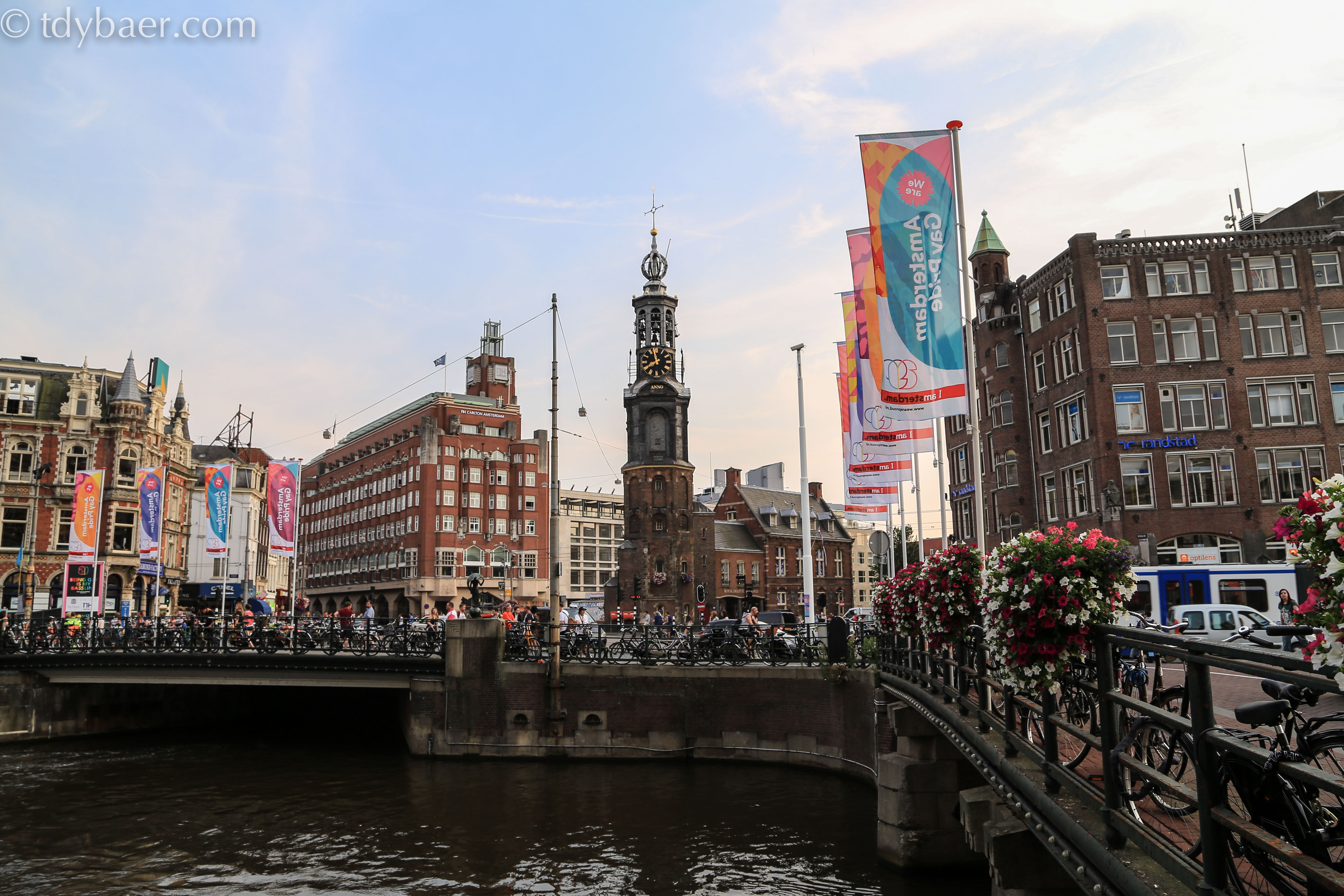 Hier sind wir am Muntplein und schauen auf den Munttoren, den schönen Turm im Hintergrund. Die vielen bunten Fahnen und jede Menge Plakate verraten uns bereits, dass an diesem Wochenende die Gay Pride stattfindet. Wer die Gelegenheit hat das mal mit zu erleben, sollte sich das unbedingt anschauen :-).
