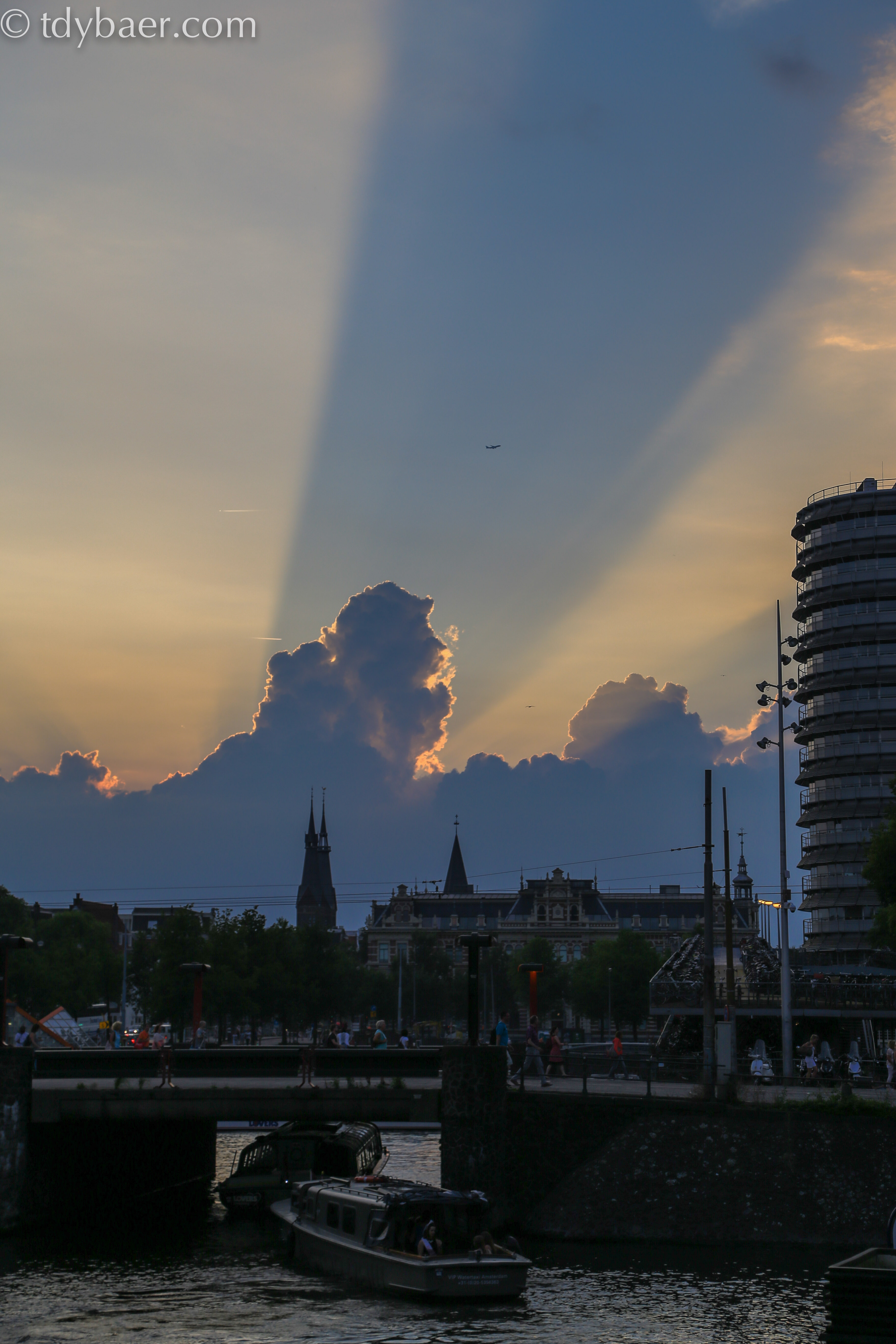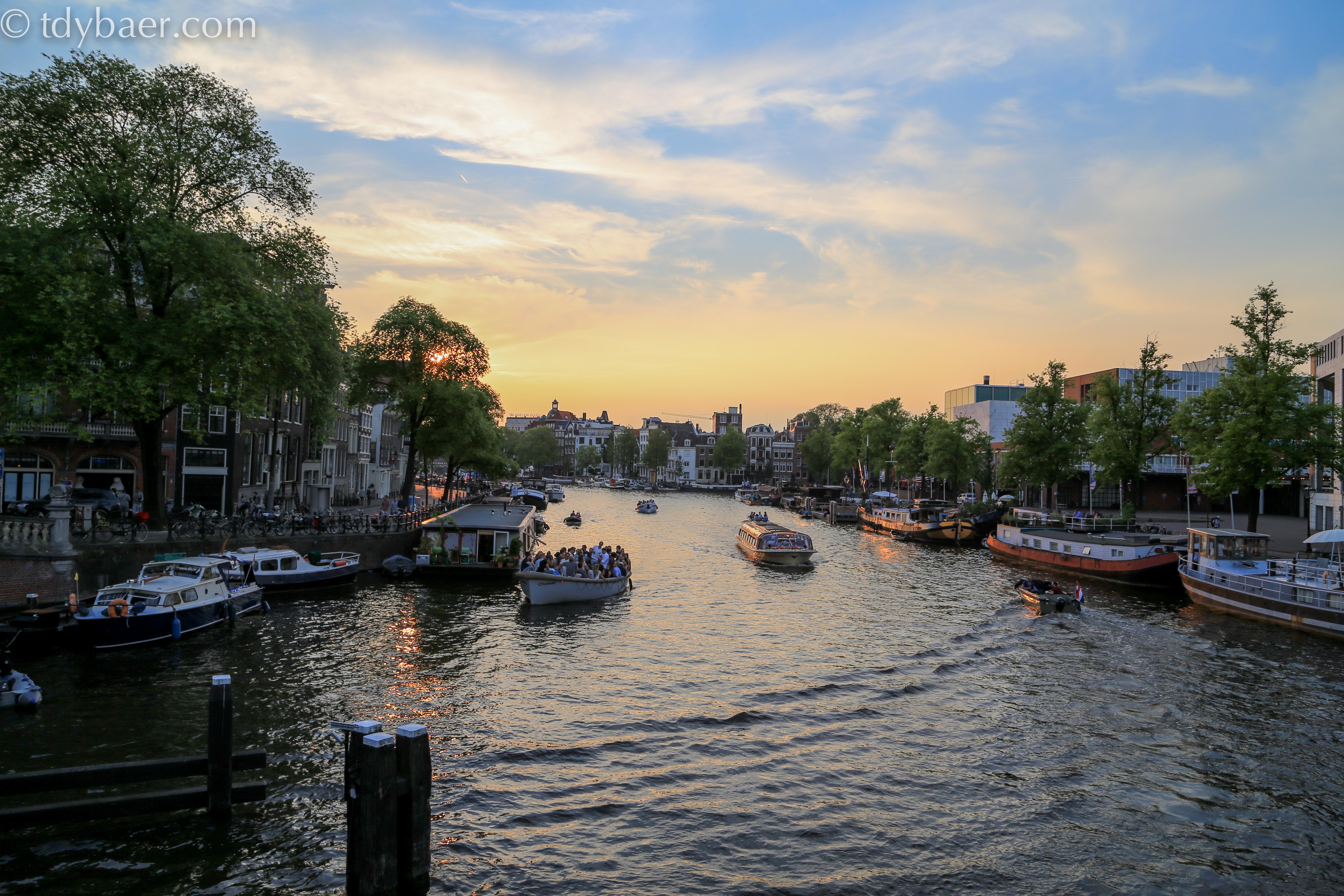 Natürlich müssen wir zum Sonnenuntergang zu unserem Lieblingsplatz in Amsterdam: die Blauwbrug neben dem Opernhaus. Hier setzen wir uns immer gerne an das Ufer der Amstel und picknicken. Dabei kann man die vorbeifahrenden Ausflugsboote beobachten und den vielen kleineren privaten Booten zuwinken.