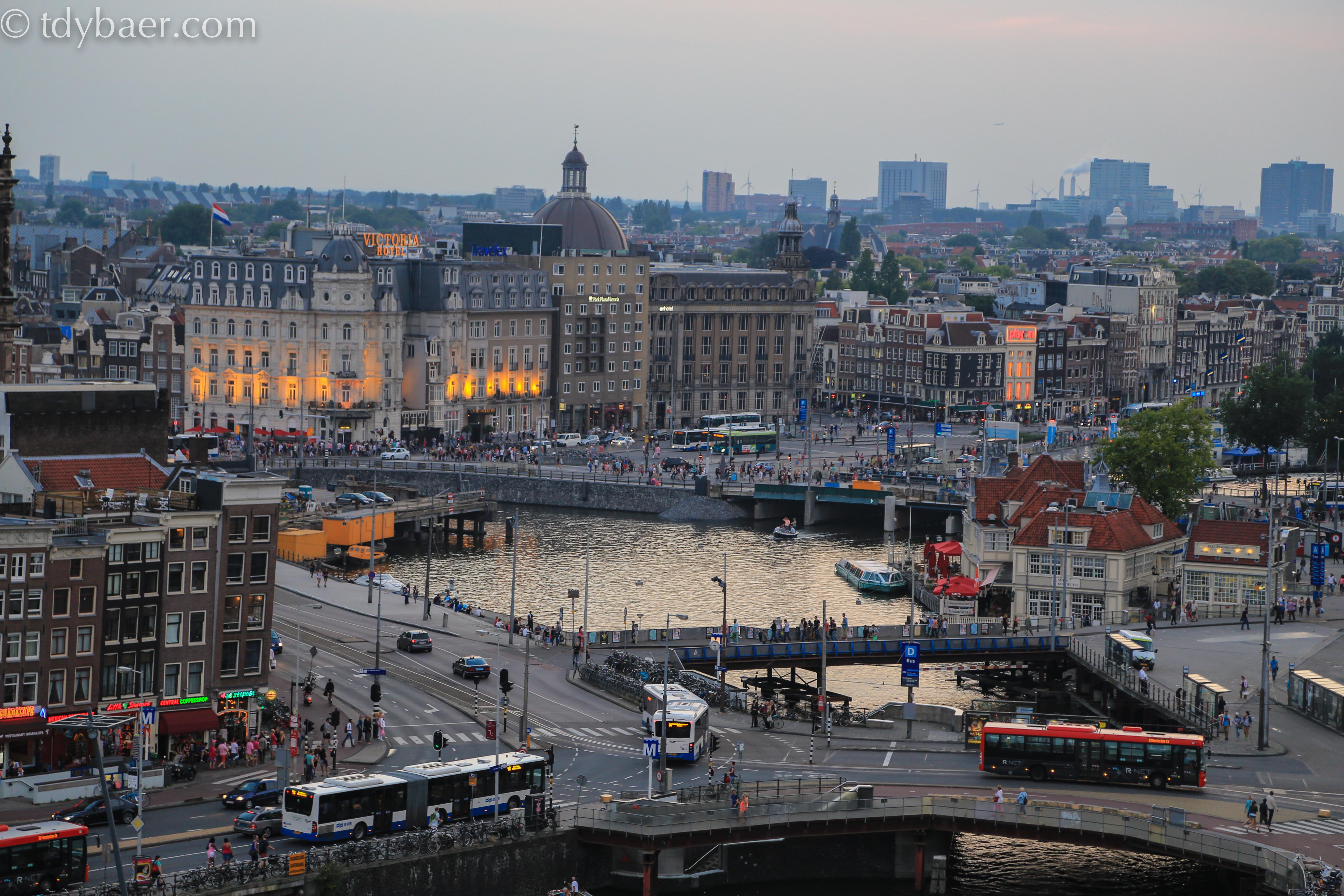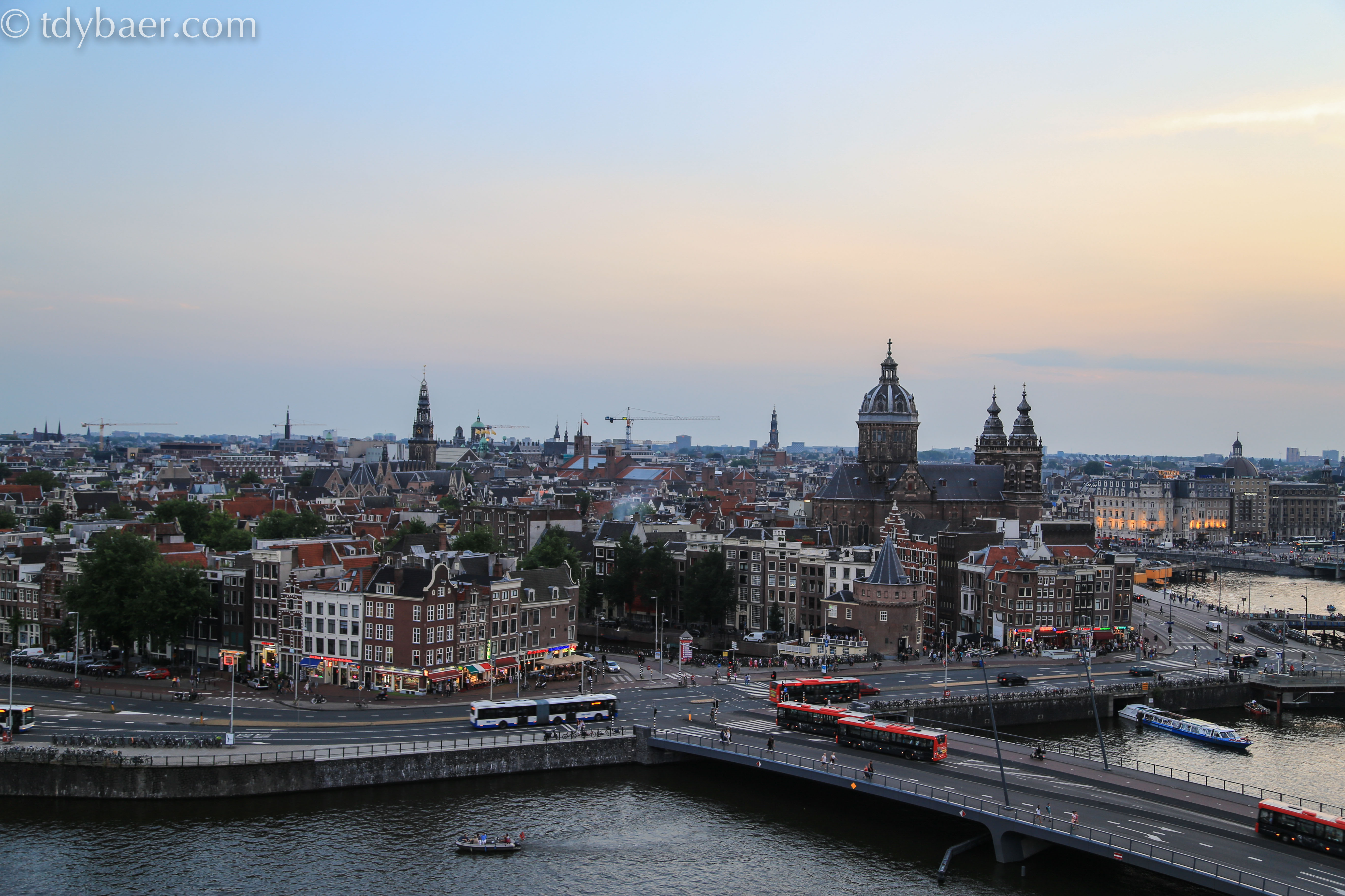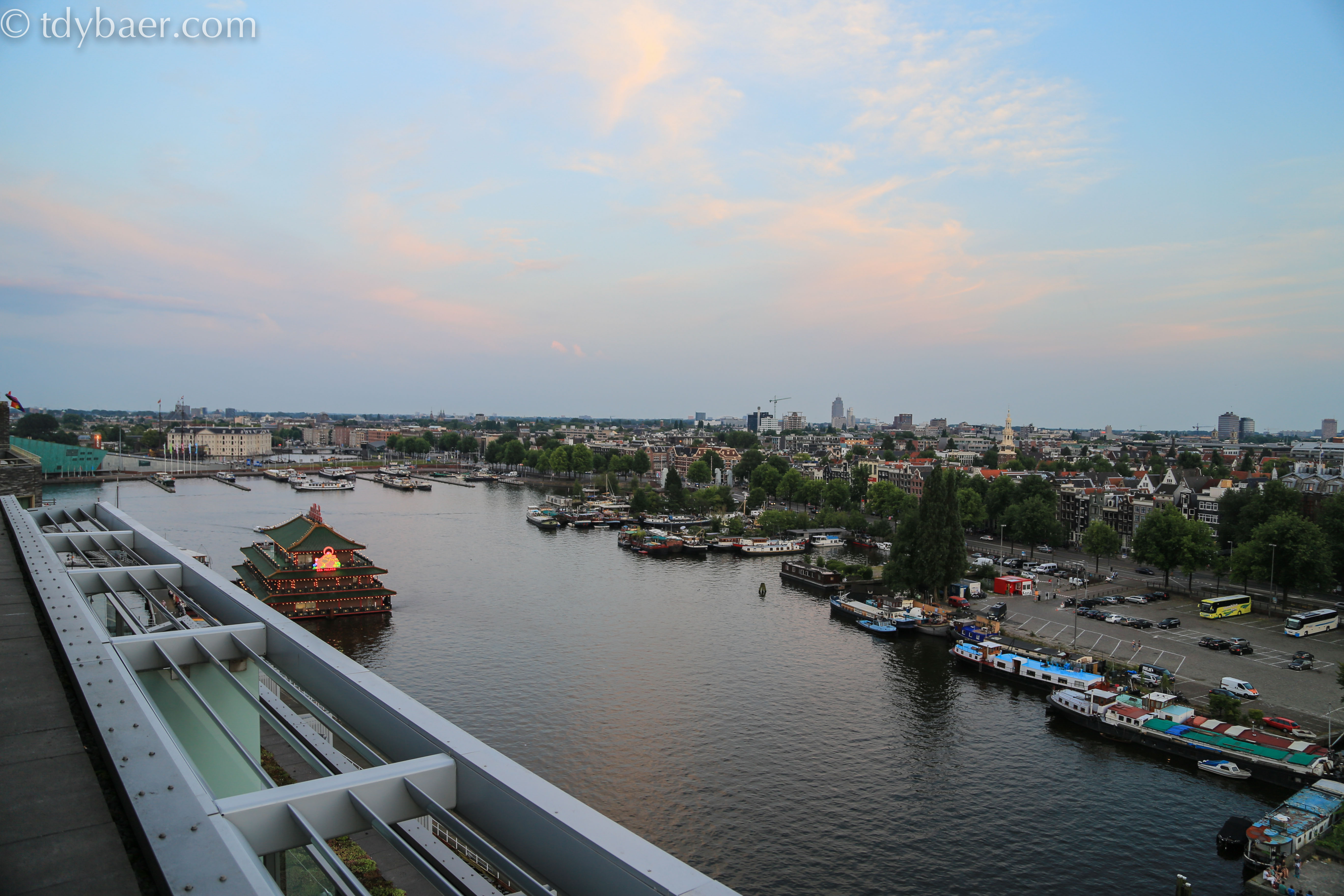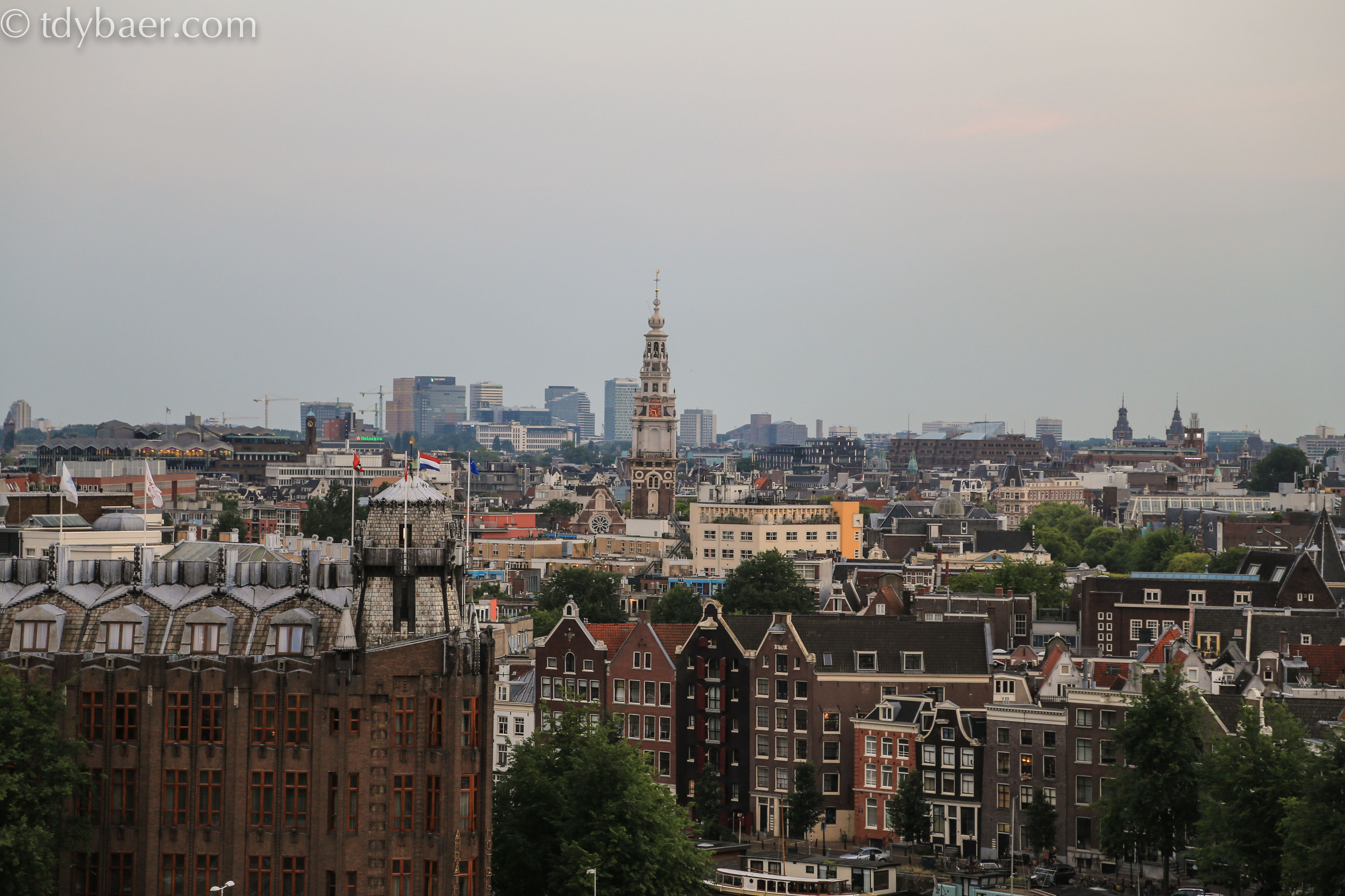 In Amsterdam gibt es nicht so viele hohe Gebäude um eine gute Aussicht auf die Stadt zu bekommen – auf die meisten Türme kommt man auch nur in Rahmen einer Führung. Auf die Dachterrasse des Hotels kommt man umsonst und man kann nebenbei auch einen etwas überteuerten Cocktail schlürfen ;-).