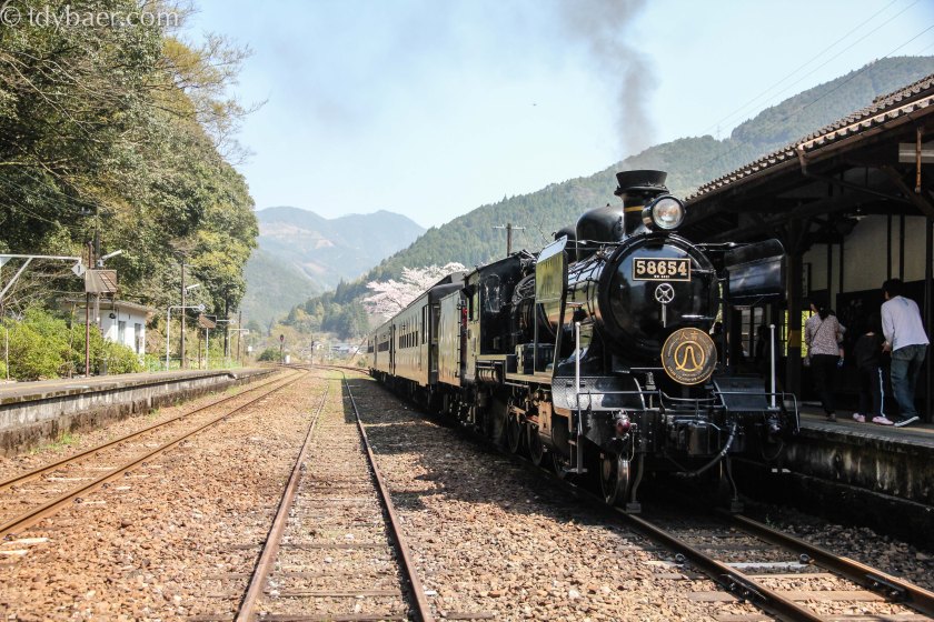 Am heutigen Tag stand die erste Zugfahrt unserer Reise auf dem Programm, von Kumamoto in die Berge nach Hitoyoshi. Das Ganze auch gleich mit einer Dampflock in schönen eingerichteten Waggons. Nach dem japanisch angehauchten Frühstück im Hotel nahmen wir für den Weg zum Bahnhof ein Taxi. Unsere Fahrkarte hatten wir bereits, die wir also nur noch am Durchgangsschalter vorzeigen mussten. Die reservierten Sitzplätze befanden sich im ersten Waggon, wo wir auch gleich unser ganzes Gepäck verstauten. Bis zur Abfahrt war noch etwas Zeit zum Besichtigen der schönen Dampflock. Gebaut wurde die Lokomotive SL58654 im Jahr 1922 von Hitachi. 1975 wurde sie als letzte noch fahrende Dampflokomotive in Japan stillgelegt, bis sie 1988 wieder zum Einsatz kam. Die Lock selbst ist schon seit etlichen Jahren auf der Insel Kyushu im Einsatz. Nach dem sie 2005 bei einer Fahrt beschädigt wurde, konnte sie später restauriert werden und fährt nun seit 2009 auf der Strecke zwischen Kumamoto und Hitoyoshi. Die Fahrten sind meist schnell ausgebucht, da der Zug nicht täglich fährt und die Japaner Zugreisen lieben. Pünktlich um 9:44 Uhr …