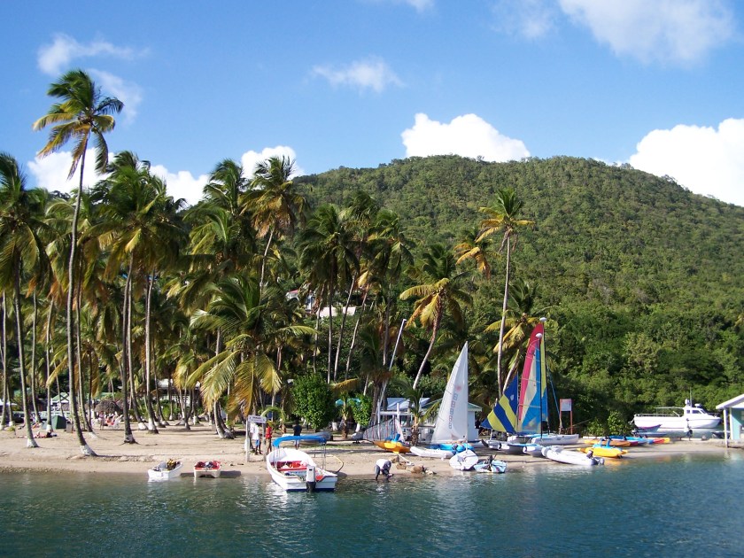 Hach, heute gehts zur letzten Insel *schluchtz*. Der Himmel weinte auch ab und zu. Ansonsten: 23-27°C, sonnig Zum Abschluß des Insel-Hoppings gönnte ich mir einen relaxten Ausflug zum Strand. Der Bus fuhr mal wieder, na ratet mal, BERGAUF und wieder runter. Hier ein kurzer Ausblick auf den tollen Magens Bay Beach, wo ich gleich meine Pfoten ins Wasser strecke. Und nun heisst es für zwei Stunden planschen und entspannen. Es ist ein echt schönes Erlebnis bei karbischem Regen im warmen Wasser zu planschen. Nass von unten und von oben 🙂