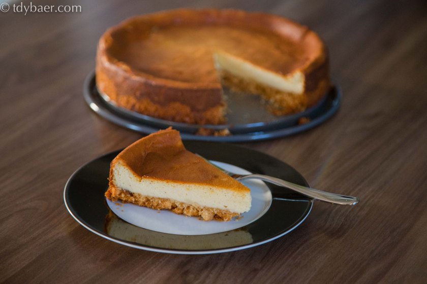 Rezepte für Käsekuchen gibt es sicher wie Sand am Meer :-). Dieses hier hat uns besonders gut geschmeckt, da der Kuchen nicht so „mächtig“ daher kommt und auch noch Platz für ein weiteres Stück lässt – außerdem ist der Zwieback-Boden super lecker :-). Zutaten: 200 g Zwieback 120 g Zucker – 50 g für den Boden und 70 g für die Creme Salz 200g weiche Butter – 80 g Butter für den Boden und 120 g für die Creme 1 El Vanillezucker 4 Eier, getrennt – Eiweiß steif schlagen 4 El Mehl 350 g Sahnequark – z.B. 20 % Speisequark + 14% Topfen Rahmstufe 125 g saure Sahne Für den Boden des Kuchens muss zuerst der Zwieback klein zerbröselt werden. Ich habe einmal die Variante Fleischklopfer … … und einmal die Variante Mixer probiert. Im Mixer wird das Ganze natürlich schön fein und der Boden etwas fester – aber mal kräftig auf den Zwieback hauen macht mehr Spaß :-). Unter den zerkrümelten Zwieback knetet man jetzt mit der Hand 50 g Zucker und 80 g …