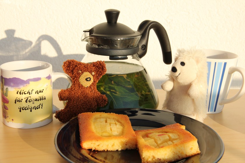 Heut war mal wieder Zeit zum Backen :-). Ziemlich viele Zutaten, also nix für Eilige, aber der Aufwand ist es wert! 6 Äpfel (à 150g) 6 EL Zitronensaft 90g Butter 75g gemahlene Mandeln 3 Eier (Kl. M) 150g Zucker Salz 125g Honig je 1 TL Zitronenschale / Orangenschale 375g Sahnejoghurt (10%) 300g feiner Hartweizengrieß 3 TL Backpulver 175 ml O-Saft Puderzucker zum bestäuben Die Äpfel schälen, vierteln, entkernen und kreuzweise leicht einschneiden. Anschließend in 2 EL Zitronensaft wenden. Nun die Schale von der Zitrone und Orange abraspeln. Die Butter schmelzen und die Mandeln in einer Pfanne ohne Fett rösten. Jetzt die Eier, 75g Zucker und eine Prise Salz 5 Minuten lang cremig schlagen. Die Zitronen- und die O-Schale, den Joghurt, die Butter sowie 75g Honig unterrühren. Jetzt den Grieß mit den Mandeln und dem Backpulver vermischen und mit je 2 EL Zitronen- und O-Saft kurz unterrühren. Den Teig auf einem gefetteten Backblech verteilen und die Äpfel mit den Einschnitten nach oben drauf verteilen. Das Ganze im heißen Ofen bei 190 Grad (Umluft 170°) 35 Minuten …