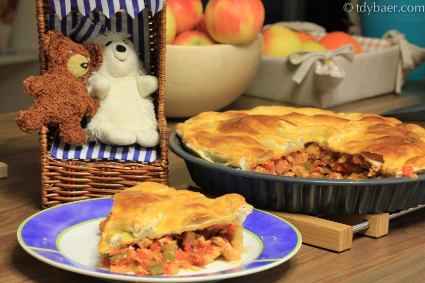 Bei Tdy und Eisigel gibt es heute wieder ein deftiges Gericht aus der spanischen Küche :-). Eine Teigpastete haben wir bisher noch nicht ausprobiert, aber so schwer kann das ja nicht sein. Das Resultat unseres ersten Versuches kann sich sehen lassen und war super lecker. Das wird es sicher bald wieder geben. Zutaten für den Teig: 500 g Mehl 1 El Weißwein einige Löffel lauwarmes Wasser :-), mit dieser Angabe sind die Schreiberlinge sehr wage, bei mir waren es eher 200 -300 ml, einfach ausprobieren 1 Tl Olivenöl 1 El Butterschmalz Salz 1 Prise Zucker Mehl für die Arbeitsfläche Fett für die Form Eigelb zum Bestreichen, verquirlt Zutaten für die Füllung: 4 El Olivenöl 500 g Schweinelende, in feine Streifen geschnitten 2 große Zwiebeln, fein gehackt 2 Knoblauchzehen, fein gehackt 2 Paprikaschoten, klein gewürfelt 125 g luftgetrockneter Schinken, gewürfelt 2 El Tomatenmark Salz und Pfeffer 1 Tl edelsüßes Paprikapulver Den Teig am Besten schon 1-2 Stunden vor der Zubereitung der Füllung herstellen, damit er eine Weile im Kühlschrank ruhen kann. Für den Teig siebt man …